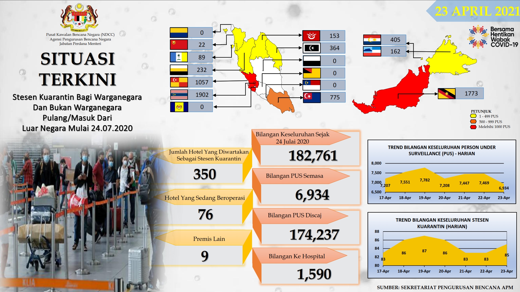 Situasi Terkini Stesen Kuarantin Bagi Warganegara Dan Bukan Warganegara Pulang/Masuk Dari Luar Negara 23/04/2021 Afrina Siaran Media 23 April 2021 Hits: 890 Rating: ( 0 Rating ) Please Rate Vote 1 Vote 2 Vote 3 Vote 4 Vote 5 Lihat / Muat Turun PDF Facebook Twitter Prev Next