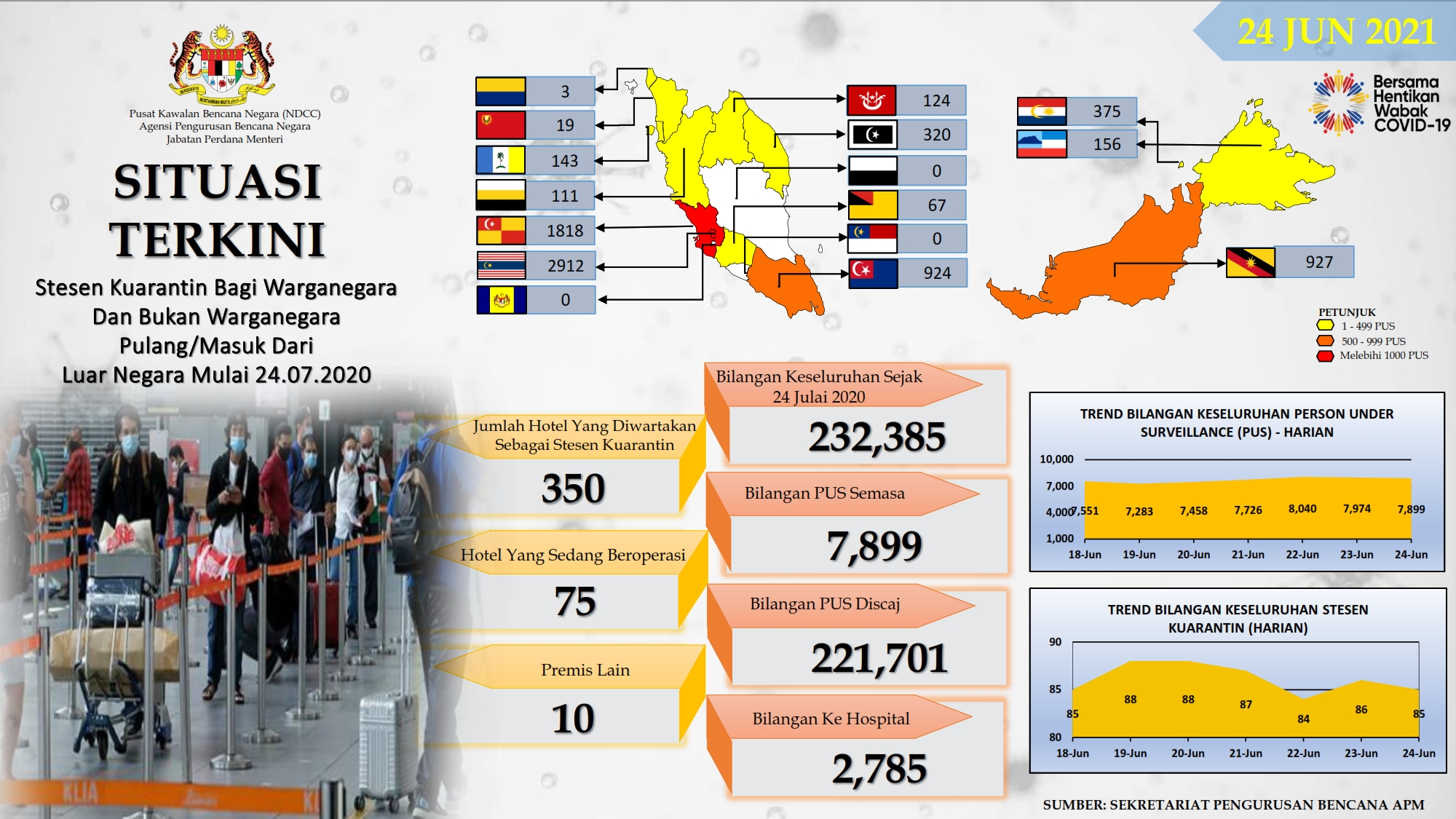 Situasi Terkini Stesen Kuarantin Bagi Warganegara Dan Bukan Warganegara Pulang/Masuk Dari Luar Negara 24/06/2021 Afrina Siaran Media 24 June 2021 Hits: 790 Rating: ( 0 Rating ) Please Rate Vote 1 Vote 2 Vote 3 Vote 4 Vote 5 Lihat / Muat Turun PDF Facebook Twitter Prev Next