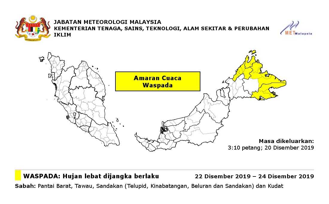 Amaran Cuaca Waspada 20/12/2019 0310 PM Aiman Cuaca 20 December 2019 Hits: 732 Rating: ( 0 Rating ) Please Rate Vote 1 Vote 2 Vote 3 Vote 4 Vote 5 Lihat / Muat Turun JPG Facebook Twitter Prev Next