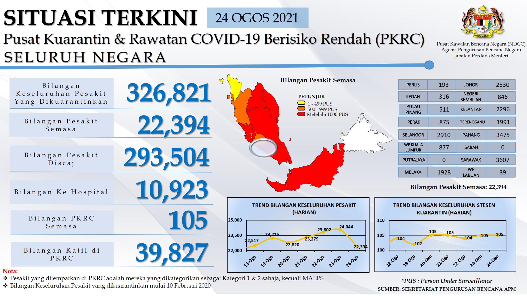 Situasi Terkini Stesen Kuarantin & Rawatan Covid-19 Berisiko Rendah (PKRC) 24/08/2021 Aiman Siaran Media 24 August 2021 Hits: 880 Rating: ( 0 Rating ) Please Rate Vote 1 Vote 2 Vote 3 Vote 4 Vote 5 Lihat / Muat Turun PDF Facebook Twitter Prev Next