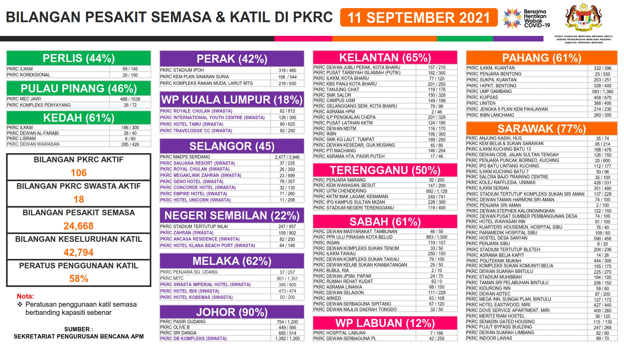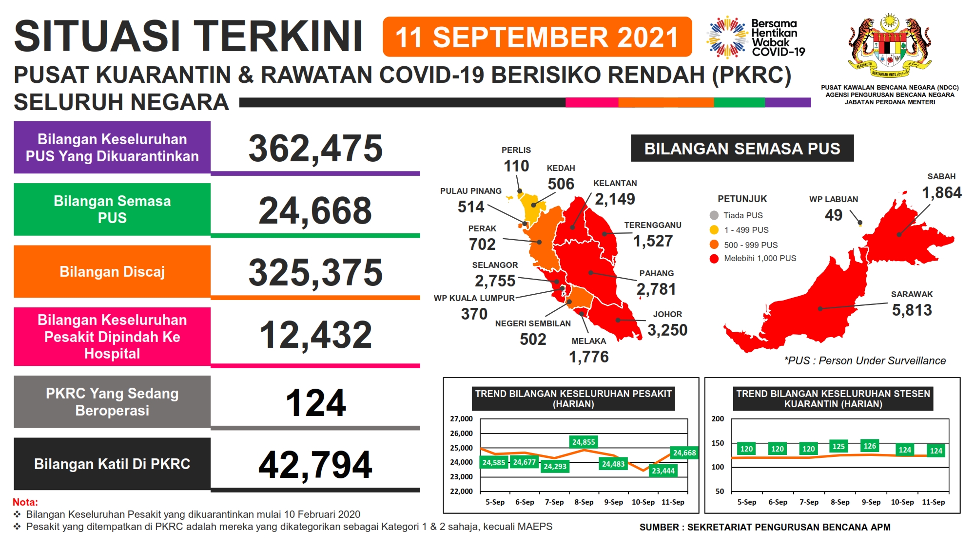 Situasi Terkini Stesen Kuarantin & Rawatan Covid-19 Berisiko Rendah (PKRC) 11/09/2021 Aiman Siaran Media 11 September 2021 Hits: 564 Rating: ( 0 Rating ) Please Rate Vote 1 Vote 2 Vote 3 Vote 4 Vote 5 Lihat / Muat Turun PDF Facebook Twitter Prev Next