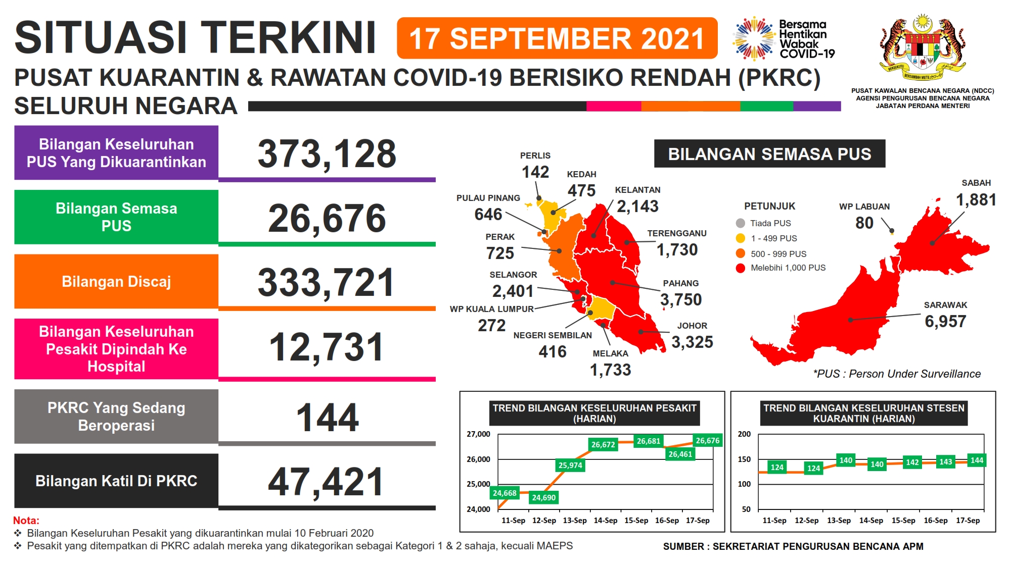 Situasi Terkini Stesen Kuarantin & Rawatan Covid-19 Berisiko Rendah (PKRC) 17/09/2021 Aiman Siaran Media 17 September 2021 Hits: 819 Rating: ( 0 Rating ) Please Rate Vote 1 Vote 2 Vote 3 Vote 4 Vote 5 Lihat / Muat Turun PDF Facebook Twitter Prev Next
