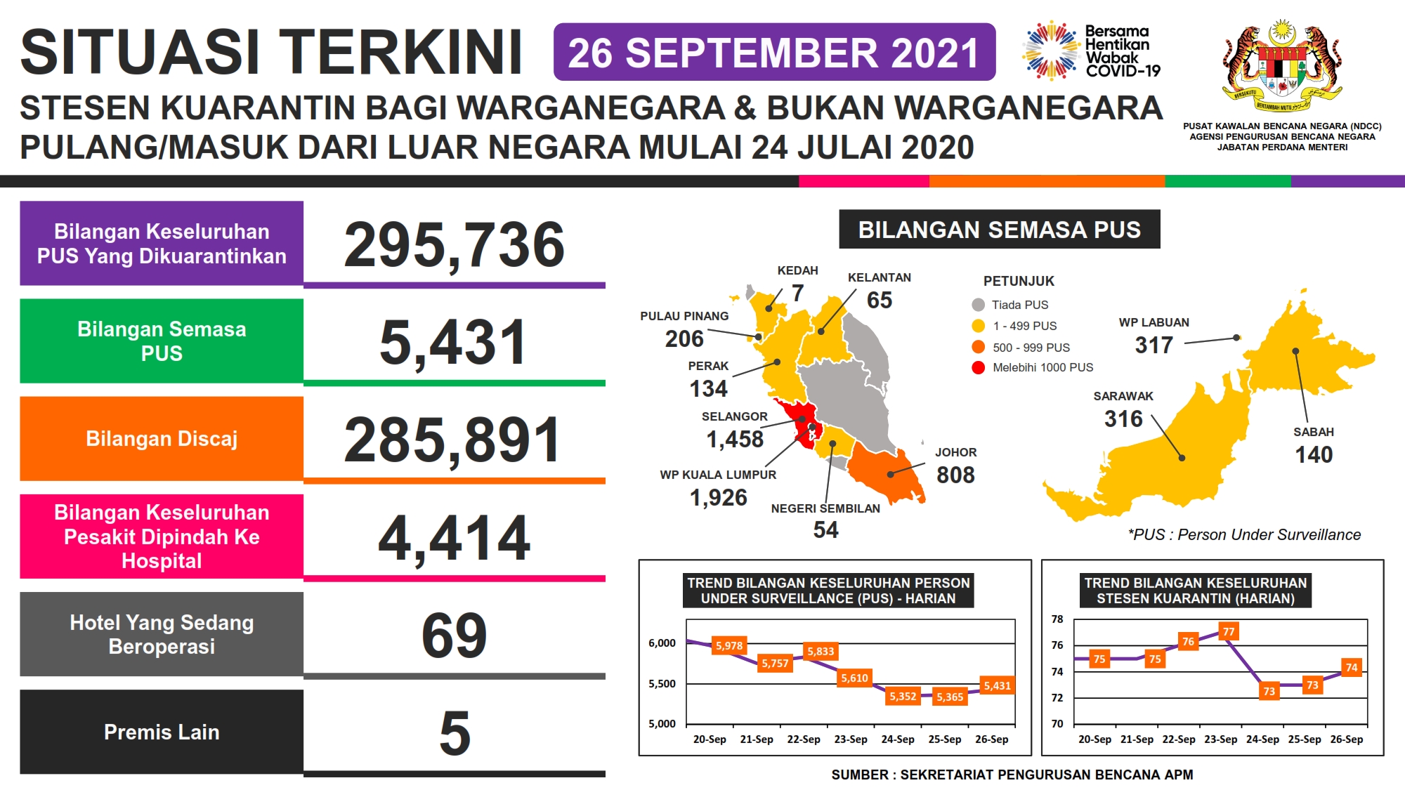 Situasi Terkini Stesen Kuarantin Bagi Warganegara Dan Bukan Warganegara Pulang/Masuk Dari Luar Negara 26/09/2021 Aiman Siaran Media 26 September 2021 Hits: 693 Rating: ( 0 Rating ) Please Rate Vote 1 Vote 2 Vote 3 Vote 4 Vote 5 Lihat / Muat Turun PDF Facebook Twitter Prev Next