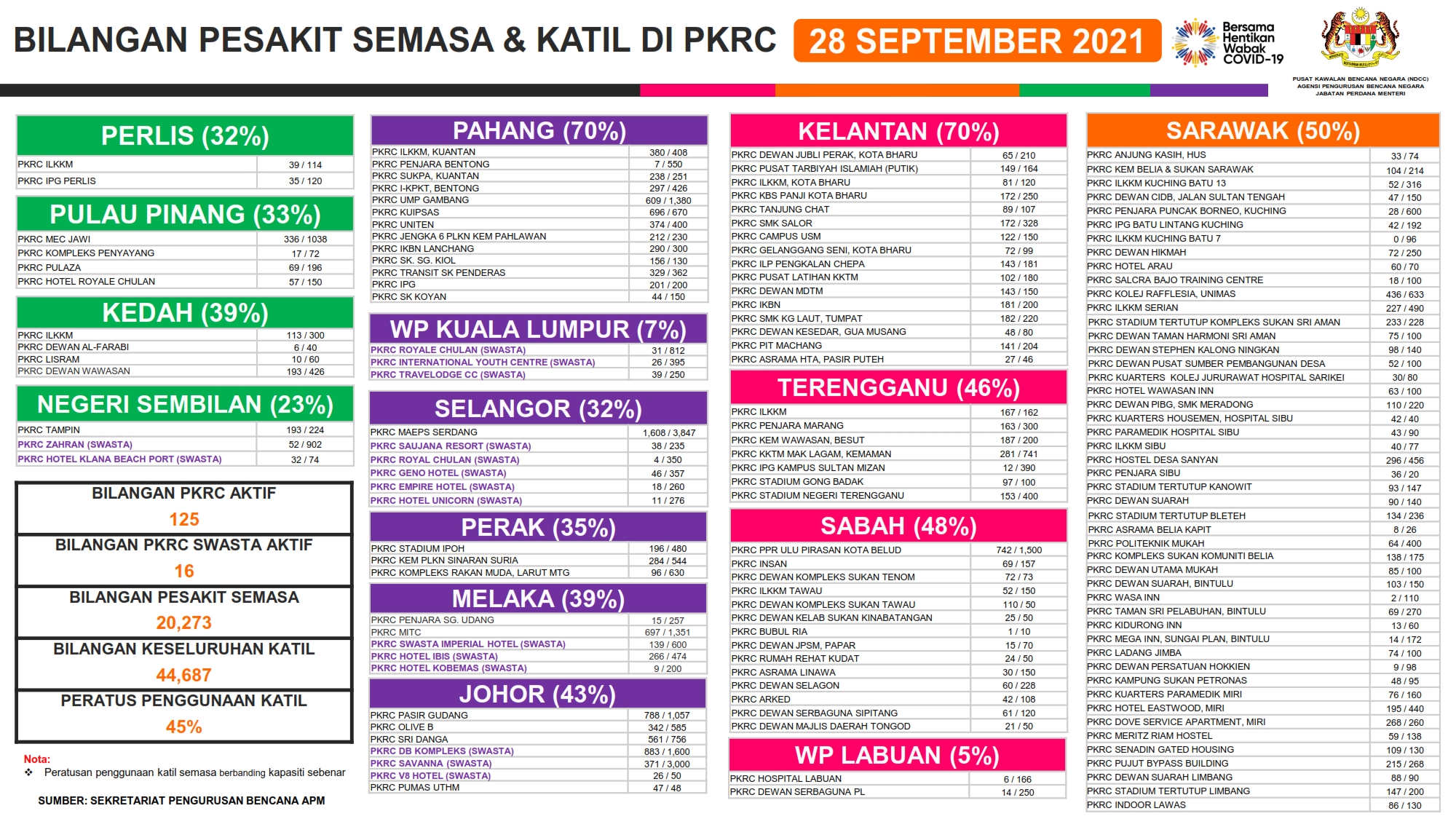 Situasi Terkini Stesen Kuarantin & Rawatan Covid-19 Berisiko Rendah (PKRC) 28/09/2021 Aiman Siaran Media 28 September 2021 Hits: 593 Rating: ( 0 Rating ) Please Rate Vote 1 Vote 2 Vote 3 Vote 4 Vote 5 Lihat / Muat Turun PDF Facebook Twitter Prev Next