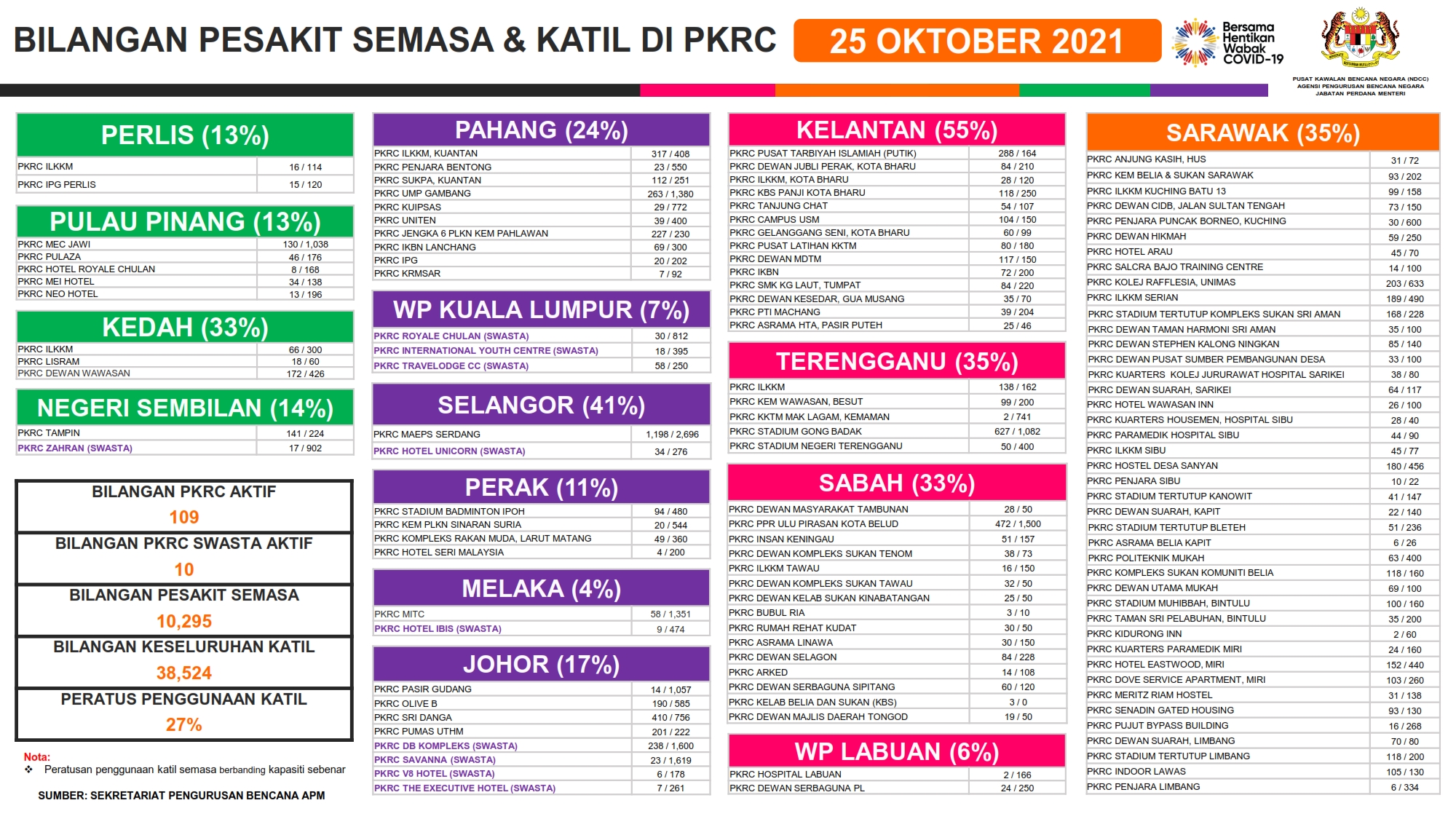 Situasi Terkini Stesen Kuarantin & Rawatan Covid-19 Berisiko Rendah (PKRC) 25/10/2021 Aiman Siaran Media 25 October 2021 Hits: 780 Rating: ( 0 Rating ) Please Rate Vote 1 Vote 2 Vote 3 Vote 4 Vote 5 Lihat / Muat Turun PDF Facebook Twitter Prev Next