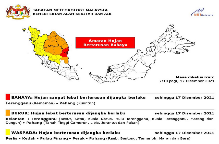 Amaran Hujan Berterusan Bahaya 17/12/2021 0710 AM Aiman Cuaca 17 December 2021 Hits: 615 Rating: ( 0 Rating ) Please Rate Vote 1 Vote 2 Vote 3 Vote 4 Vote 5 Lihat / Muat Turun JPG Facebook Twitter Prev Next