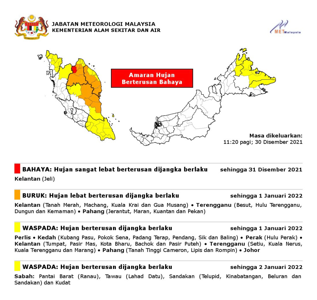 Amaran Hujan Berterusan Bahaya 30/12/2021 1120 AM Aiman Cuaca 30 December 2021 Hits: 847 Rating: ( 0 Rating ) Please Rate Vote 1 Vote 2 Vote 3 Vote 4 Vote 5 Lihat / Muat Turun JPG Facebook Twitter Prev Next