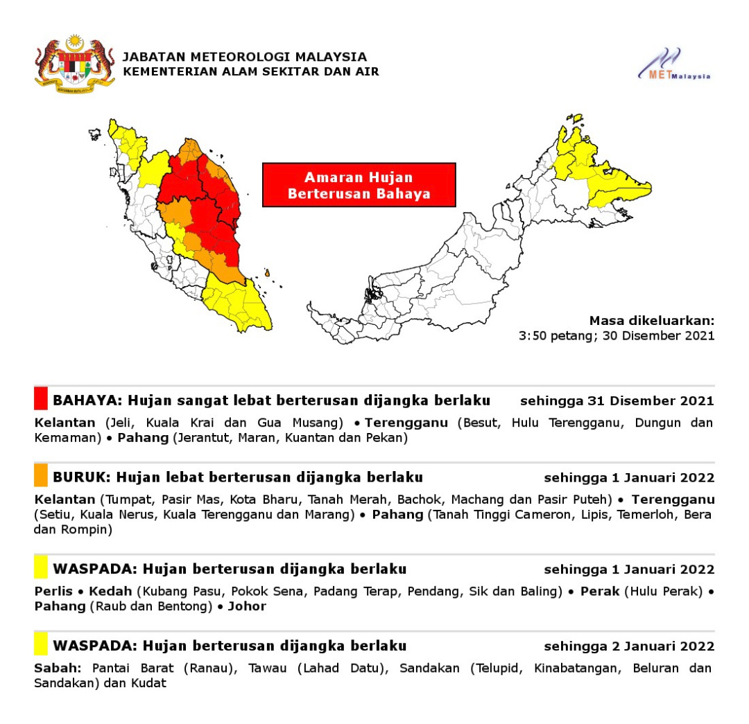 Amaran Hujan Berterusan Bahaya 30/12/2021 0350 PM Aiman Cuaca 30 December 2021 Hits: 852 Rating: ( 0 Rating ) Please Rate Vote 1 Vote 2 Vote 3 Vote 4 Vote 5 Lihat / Muat Turun JPG Facebook Twitter Prev Next