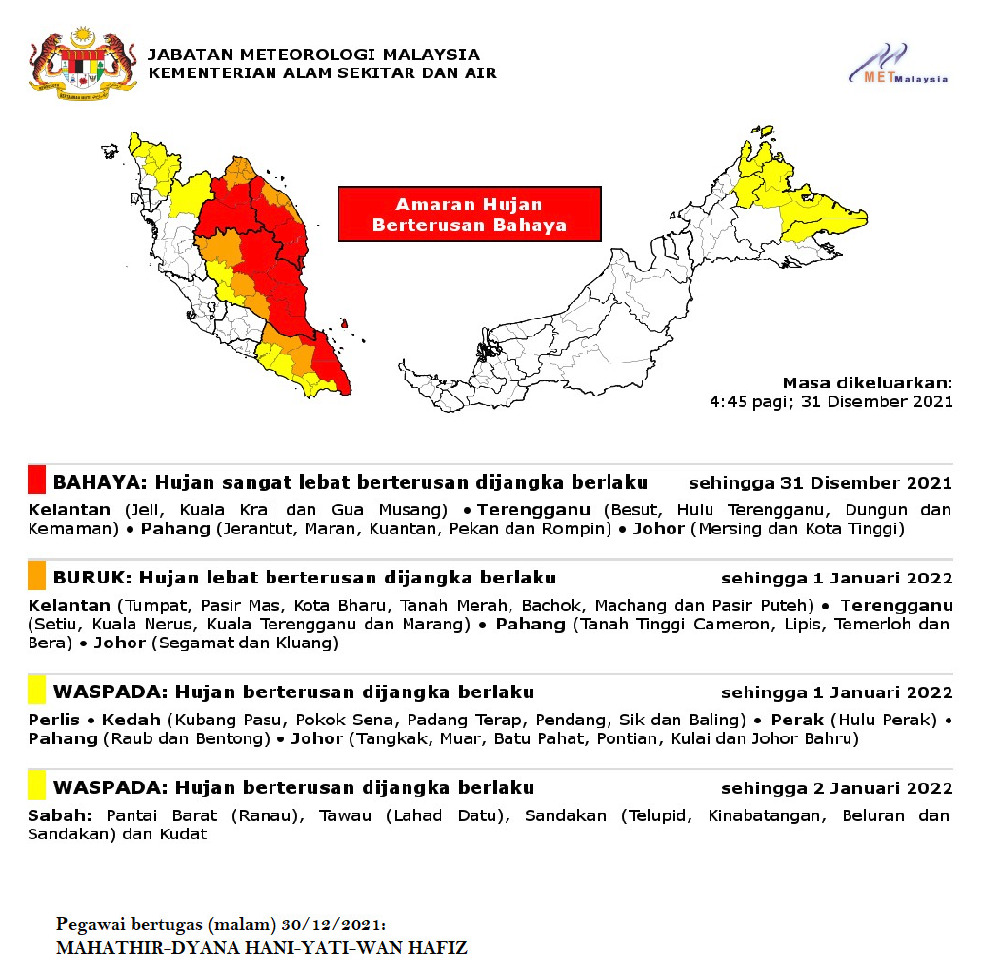 Amaran Hujan Berterusan Bahaya 31/12/2021 0445 AM Aiman Cuaca 31 December 2021 Hits: 901 Rating: ( 0 Rating ) Please Rate Vote 1 Vote 2 Vote 3 Vote 4 Vote 5 Lihat / Muat Turun JPG Facebook Twitter Prev Next