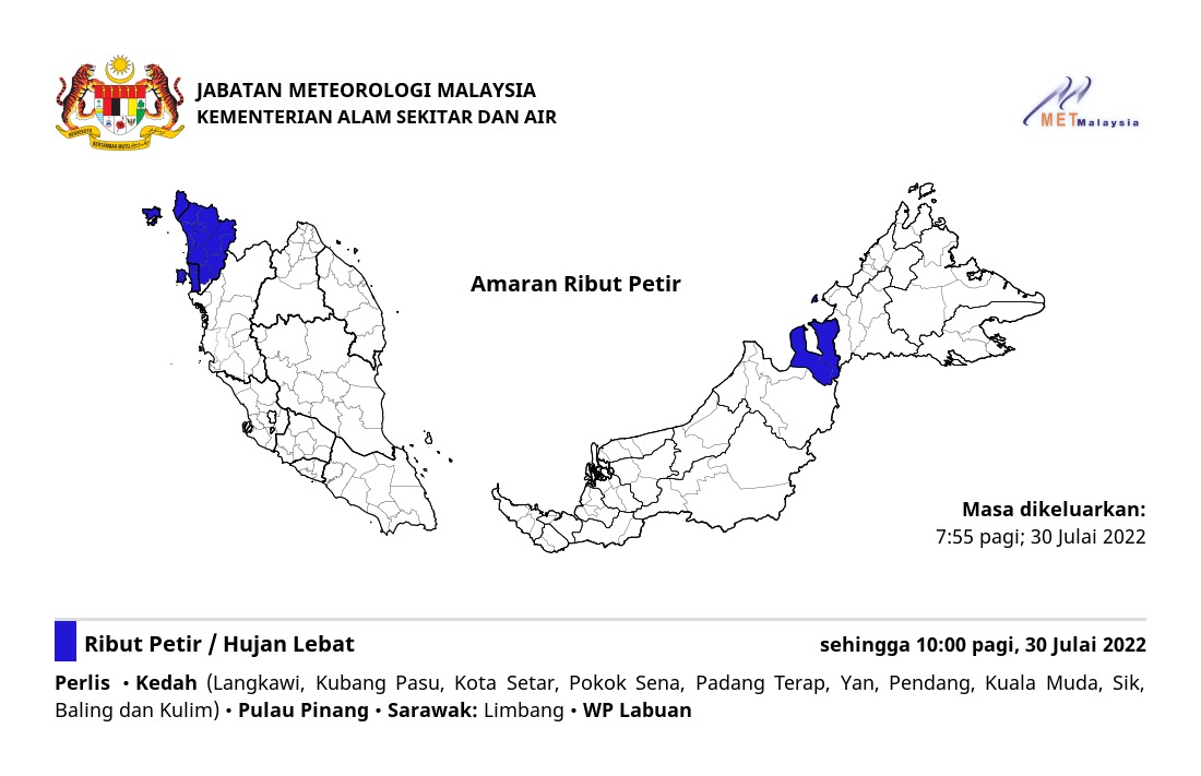 Amaran Ribut Petir 30/07/2022 0755 AM Norbazliah Cuaca 30 July 2022 Hits: 326 Rating: ( 0 Rating ) Please Rate Vote 1 Vote 2 Vote 3 Vote 4 Vote 5 Lihat / Muat Turun JPG Facebook Twitter Prev Next