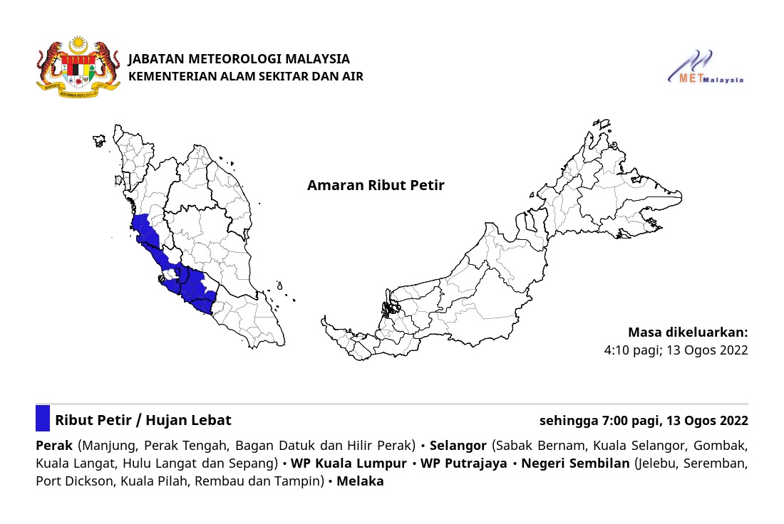 Amaran Ribut Petir 13/08/2022 0410 AM Norbazliah Cuaca 13 August 2022 Hits: 540 Rating: ( 0 Rating ) Please Rate Vote 1 Vote 2 Vote 3 Vote 4 Vote 5 Lihat / Muat Turun JPG Facebook Twitter Prev Next