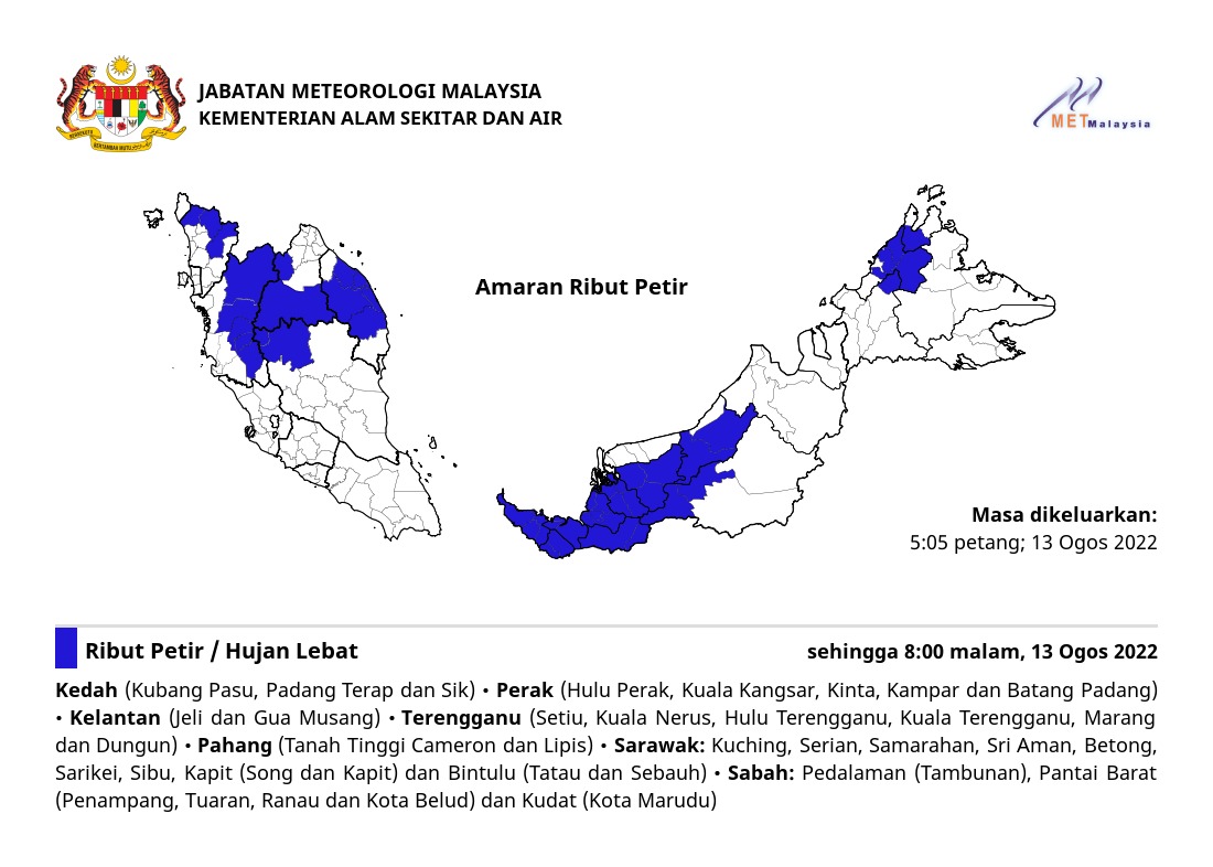 Amaran Ribut Petir 13/08/2022 1705 PM Norbazliah Cuaca 13 August 2022 Hits: 399 Rating: ( 0 Rating ) Please Rate Vote 1 Vote 2 Vote 3 Vote 4 Vote 5 Lihat / Muat Turun JPG Facebook Twitter Prev Next