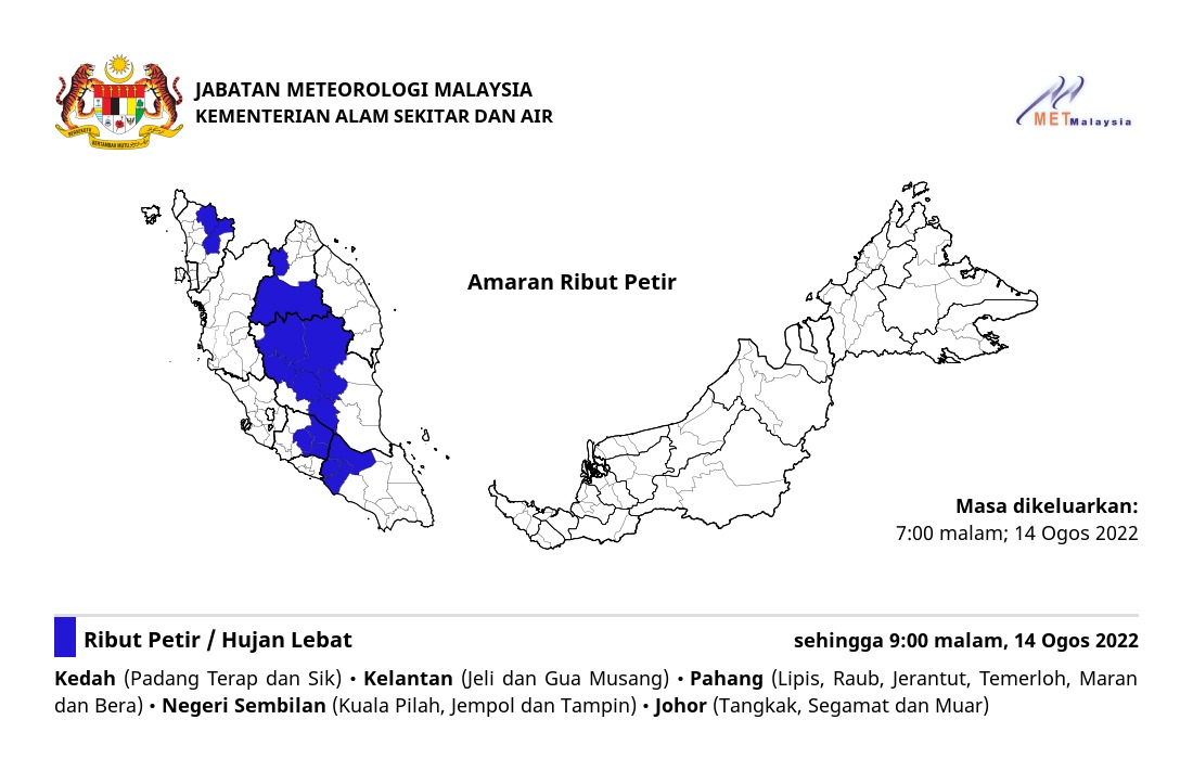 Amaran Ribut Petir 14/08/2022 1900 PM Norbazliah Cuaca 14 August 2022 Hits: 355 Rating: ( 0 Rating ) Please Rate Vote 1 Vote 2 Vote 3 Vote 4 Vote 5 Lihat / Muat Turun JPG Facebook Twitter Prev Next