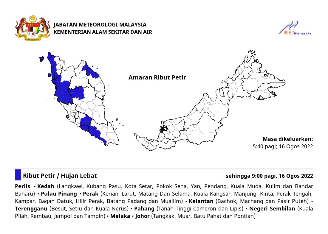 Amaran Ribut Petir 16/08/2022 0540 AM Norbazliah Cuaca 16 August 2022 Hits: 343 Rating: ( 0 Rating ) Please Rate Vote 1 Vote 2 Vote 3 Vote 4 Vote 5 Lihat / Muat Turun JPG Facebook Twitter Prev Next