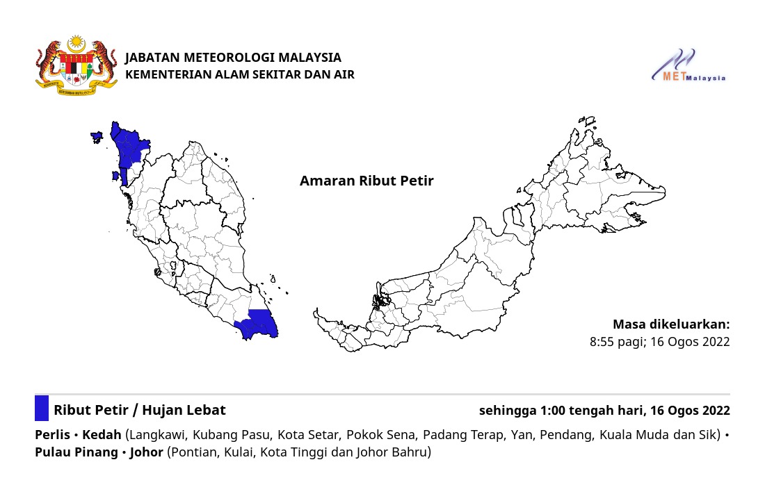 Amaran Ribut Petir 16/08/2022 0855 AM Norbazliah Cuaca 16 August 2022 Hits: 324 Rating: ( 0 Rating ) Please Rate Vote 1 Vote 2 Vote 3 Vote 4 Vote 5 Lihat / Muat Turun JPG Facebook Twitter Prev Next