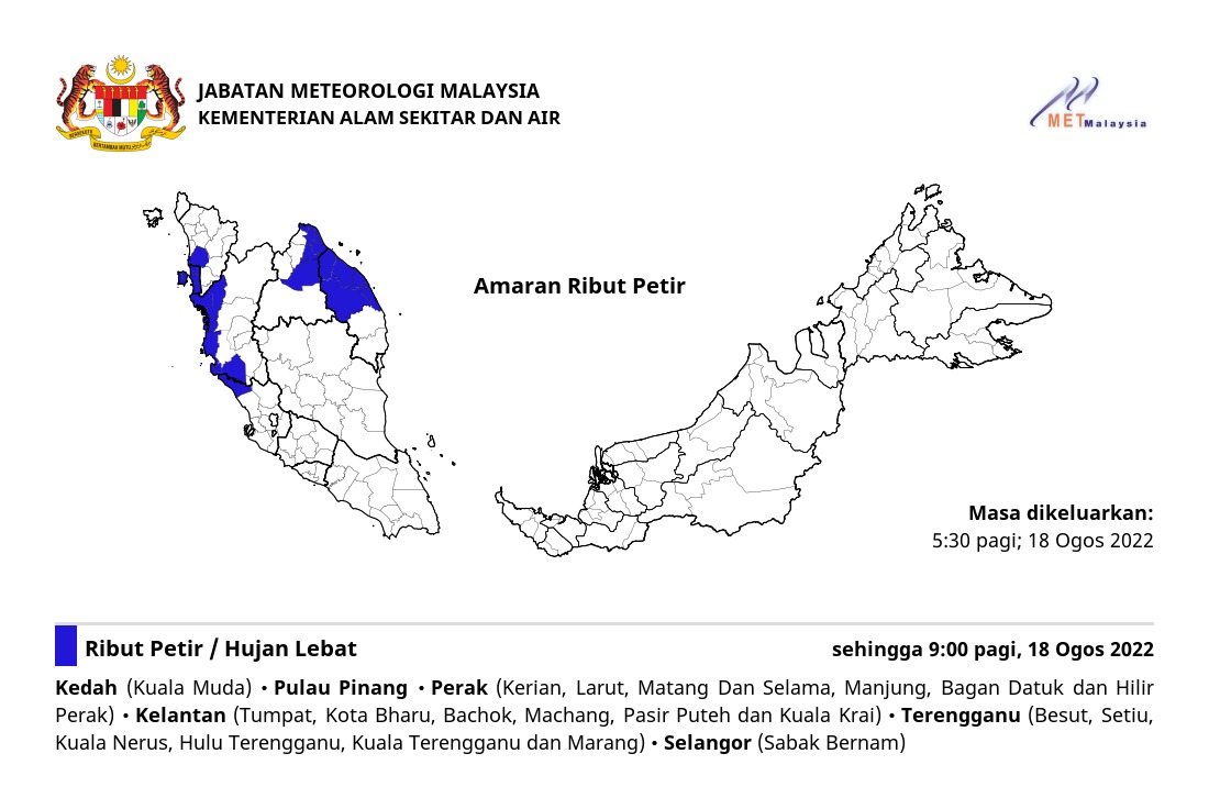 Amaran Ribut Petir 18/08/2022 0530 AM Norbazliah Cuaca 18 August 2022 Hits: 287 Rating: ( 0 Rating ) Please Rate Vote 1 Vote 2 Vote 3 Vote 4 Vote 5 Lihat / Muat Turun JPG Facebook Twitter Prev Next