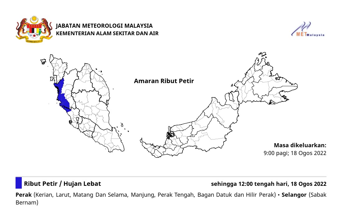 Amaran Ribut Petir 18/08/2022 0900 AM Norbazliah Cuaca 18 August 2022 Hits: 288 Rating: ( 0 Rating ) Please Rate Vote 1 Vote 2 Vote 3 Vote 4 Vote 5 Lihat / Muat Turun JPG Facebook Twitter Prev Next