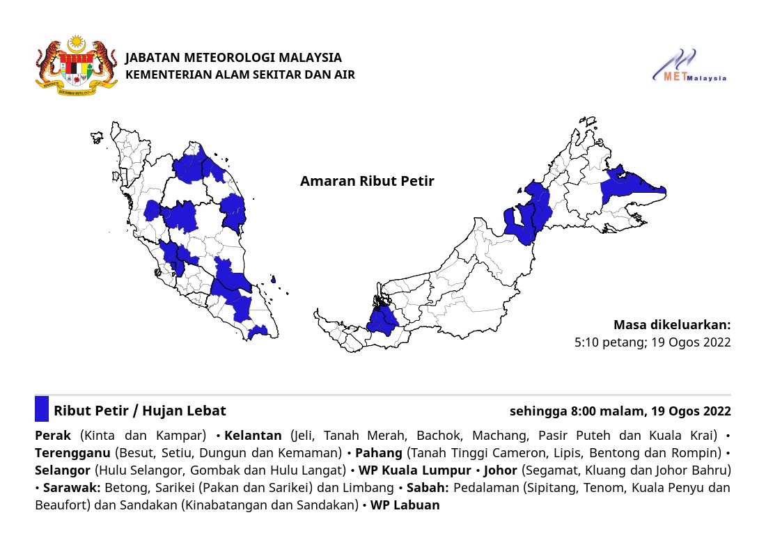 Amaran Ribut Petir 19/08/2022 1710 PM Norbazliah Cuaca 19 August 2022 Hits: 357 Rating: ( 0 Rating ) Please Rate Vote 1 Vote 2 Vote 3 Vote 4 Vote 5 Lihat / Muat Turun JPG Facebook Twitter Prev Next