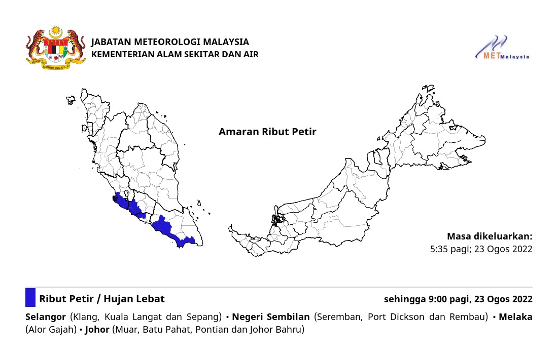 Amaran Ribut Petir 23/08/2022 0535 AM Norbazliah Cuaca 23 August 2022 Hits: 348 Rating: ( 0 Rating ) Please Rate Vote 1 Vote 2 Vote 3 Vote 4 Vote 5 Lihat / Muat Turun JPG Facebook Twitter Prev Next