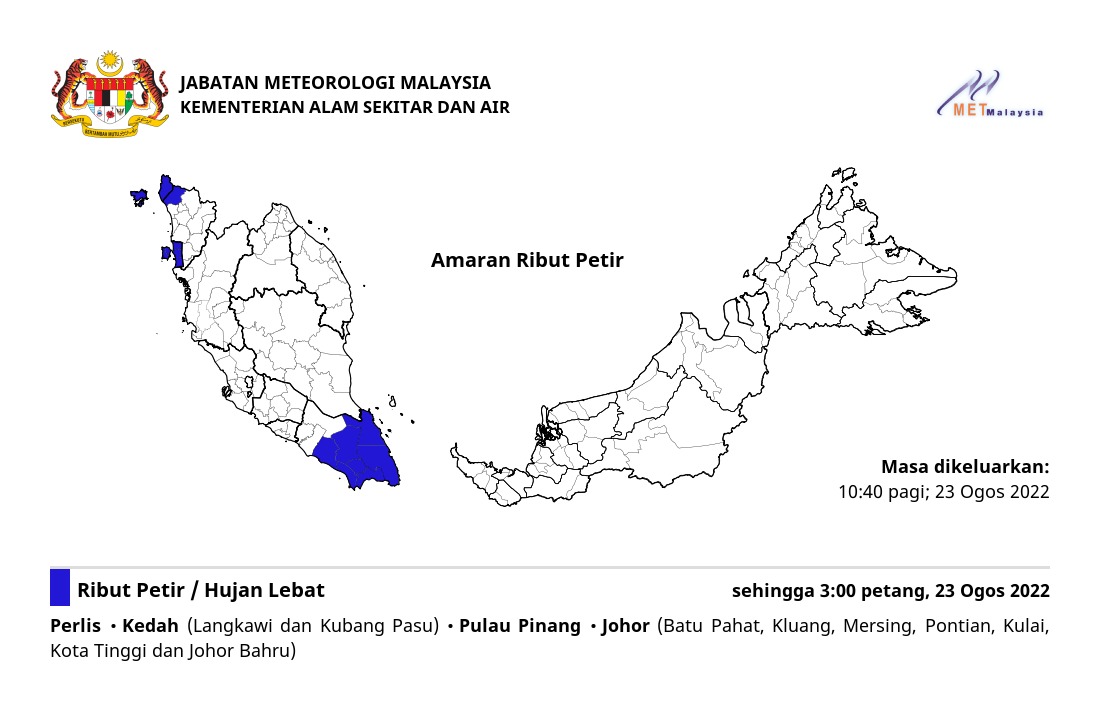 Amaran Ribut Petir 23/08/2022 1040 AM Norbazliah Cuaca 23 August 2022 Hits: 335 Rating: ( 0 Rating ) Please Rate Vote 1 Vote 2 Vote 3 Vote 4 Vote 5 Lihat / Muat Turun JPG Facebook Twitter Prev Next