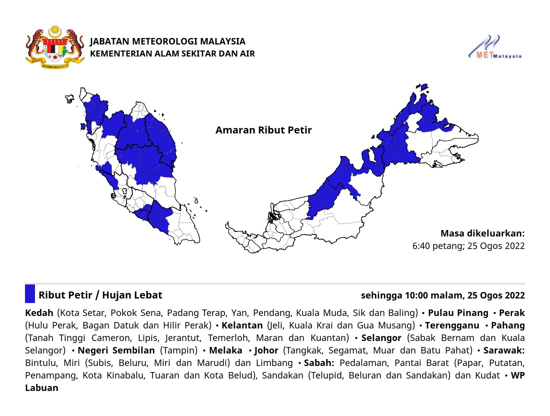 Amaran Ribut Petir 25/08/2022 1840 PM1 Norbazliah Cuaca 25 August 2022 Hits: 336 Rating: ( 0 Rating ) Please Rate Vote 1 Vote 2 Vote 3 Vote 4 Vote 5 Lihat / Muat Turun JPG Facebook Twitter Prev Next