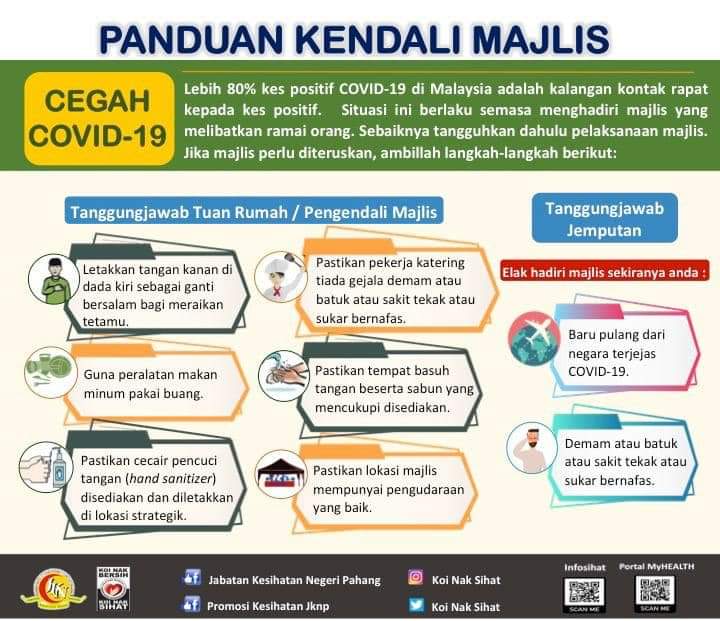 COVID-19 - Panduan Kendali Majlis 14/03/2020 Asrul Nasihat 14 March 2020 Hits: 977 Rating: ( 0 Rating ) Please Rate Vote 1 Vote 2 Vote 3 Vote 4 Vote 5 Lihat / Muat Turun JPG Facebook Twitter Prev Next