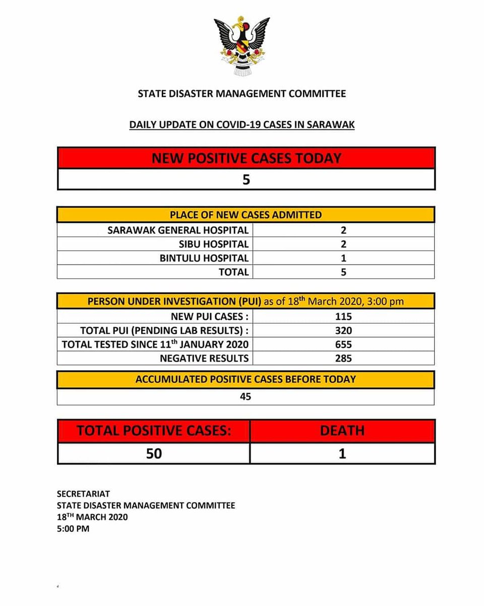 Statistik Harian Kes COVID-19 Di Sarawak 18/03/2020 0500 PM Asrul Siaran Media 18 March 2020 Hits: 1017 Rating: ( 0 Rating ) Please Rate Vote 1 Vote 2 Vote 3 Vote 4 Vote 5 Lihat / Muat Turun JPG Facebook Twitter Prev Next