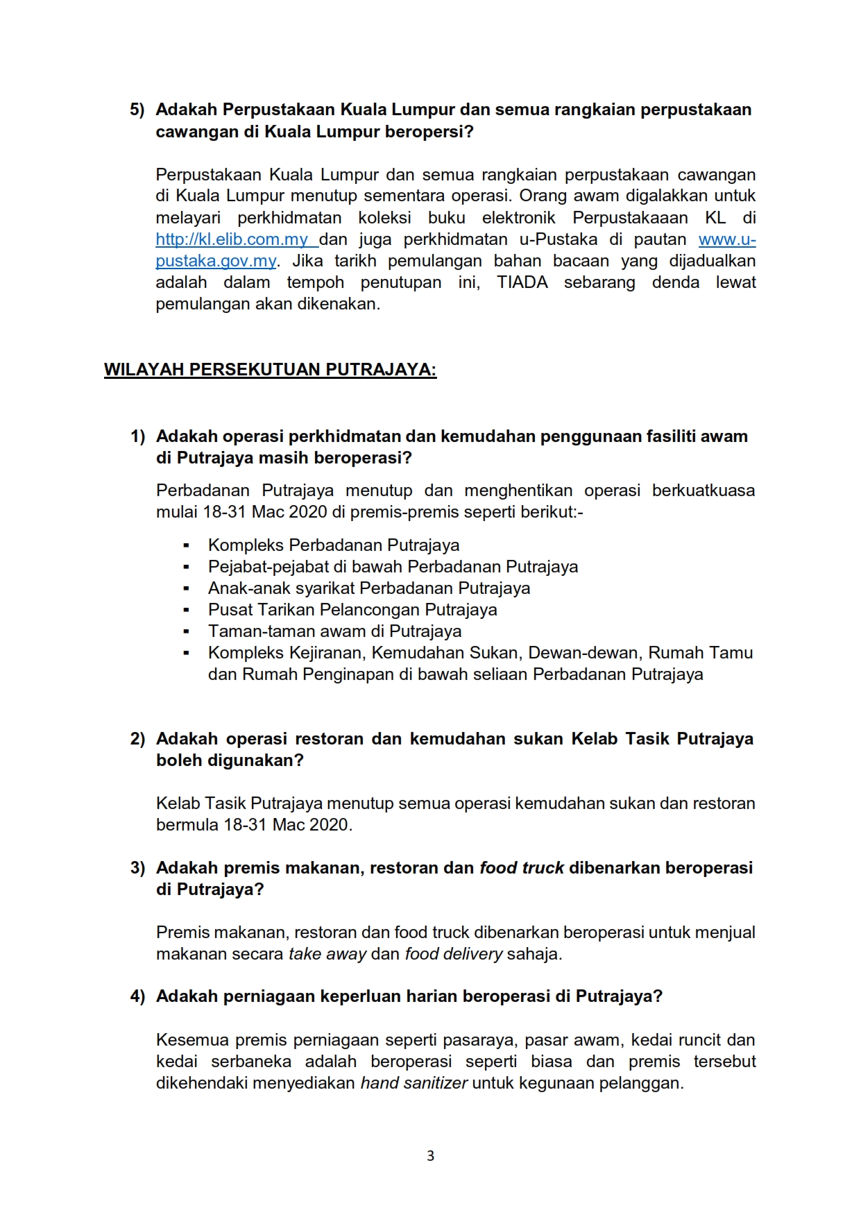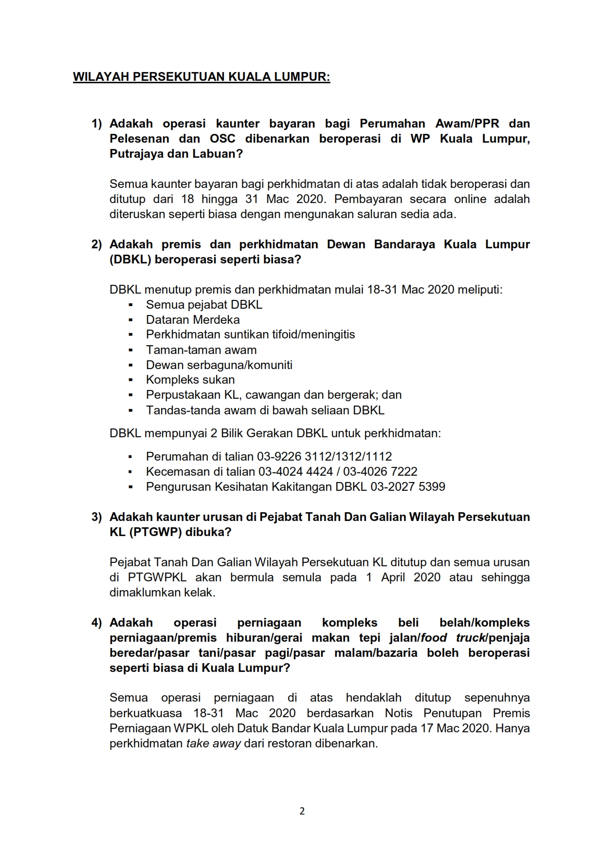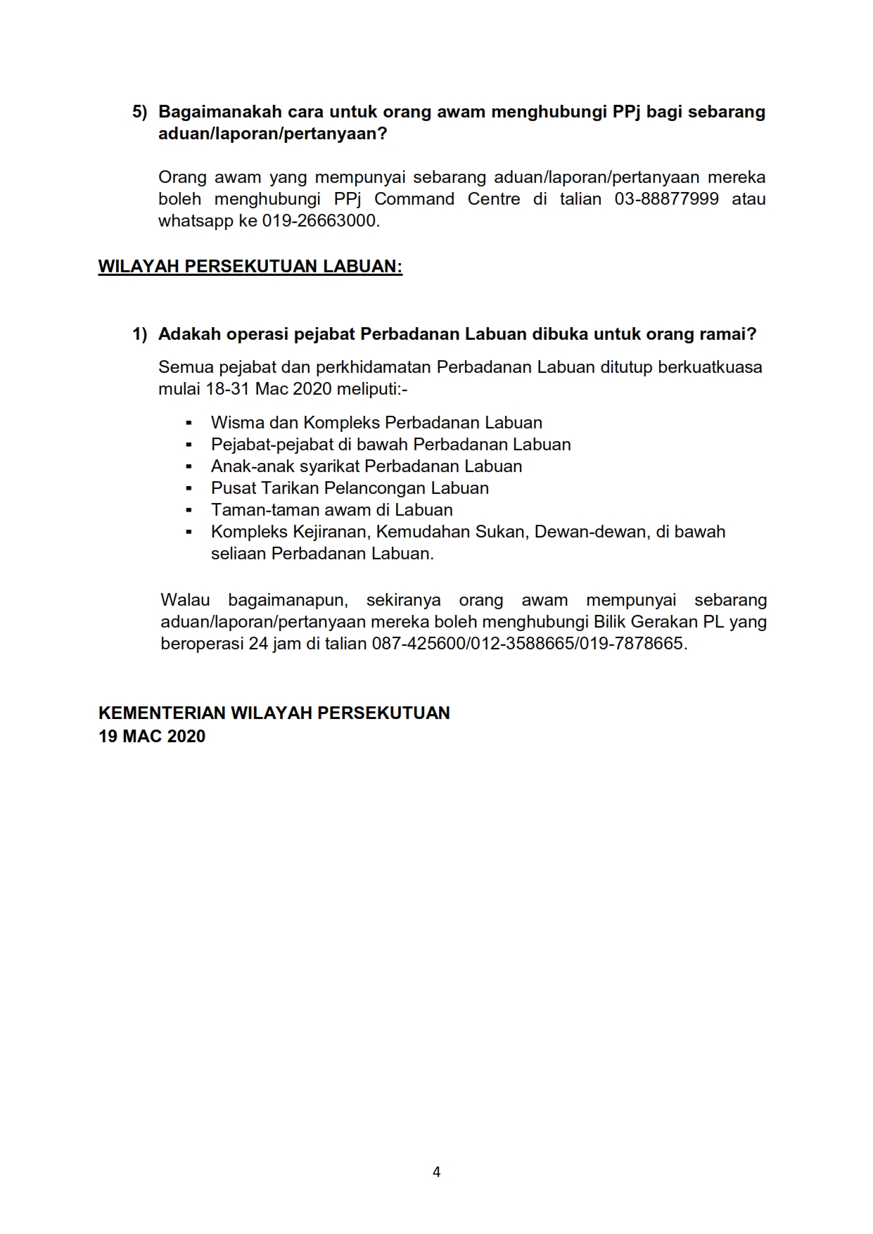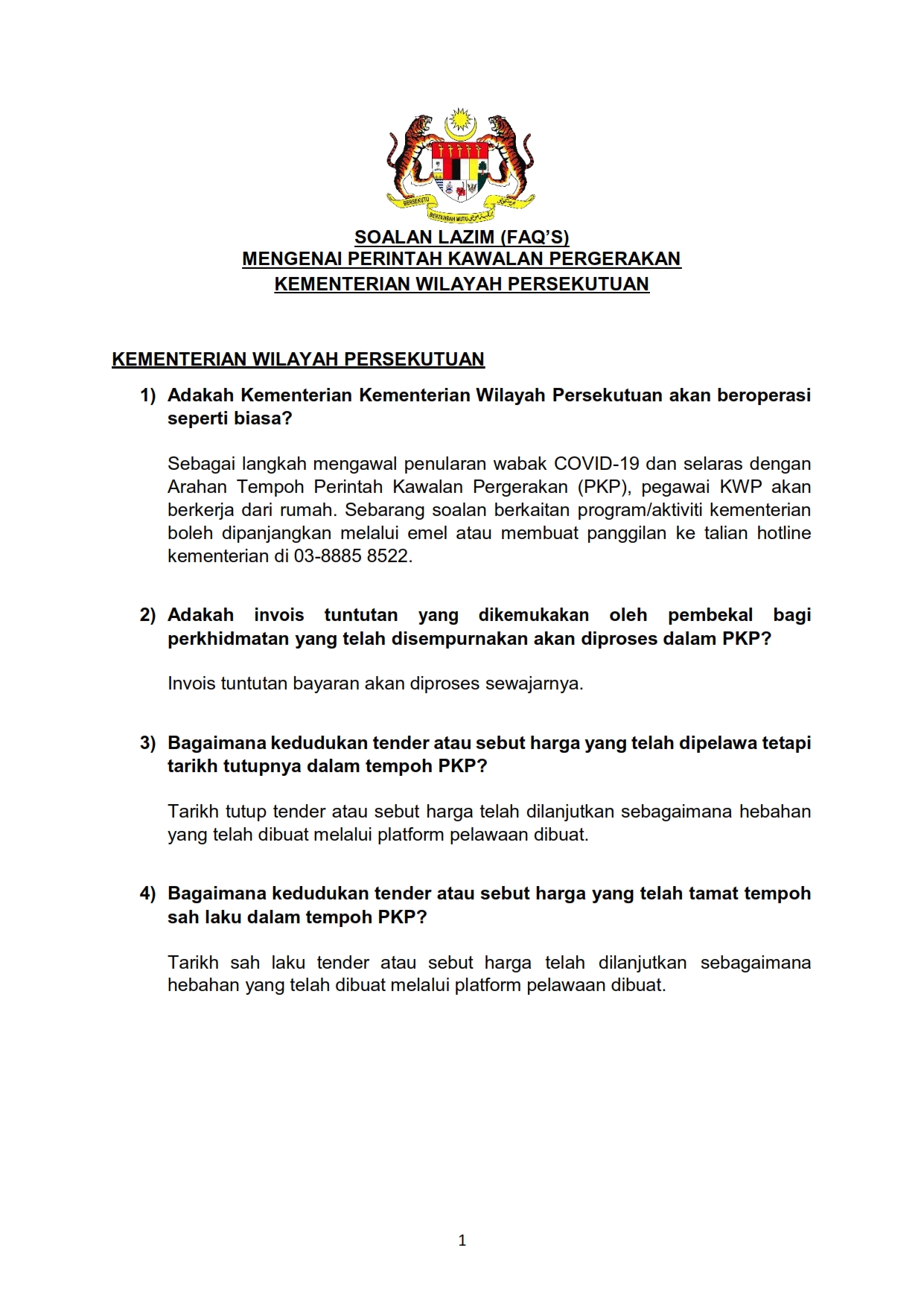 Soalan Lazim FAQ Mengenai Perintah Kawalan Pergerakan Kementerian Wilayah Persekutuan (KWP) 19/03/2020 Aiman FAQ 19 March 2020 Hits: 1249 Rating: ( 0 Rating ) Please Rate Vote 1 Vote 2 Vote 3 Vote 4 Vote 5 Lihat / Muat Turun PDF Facebook Twitter Prev Next