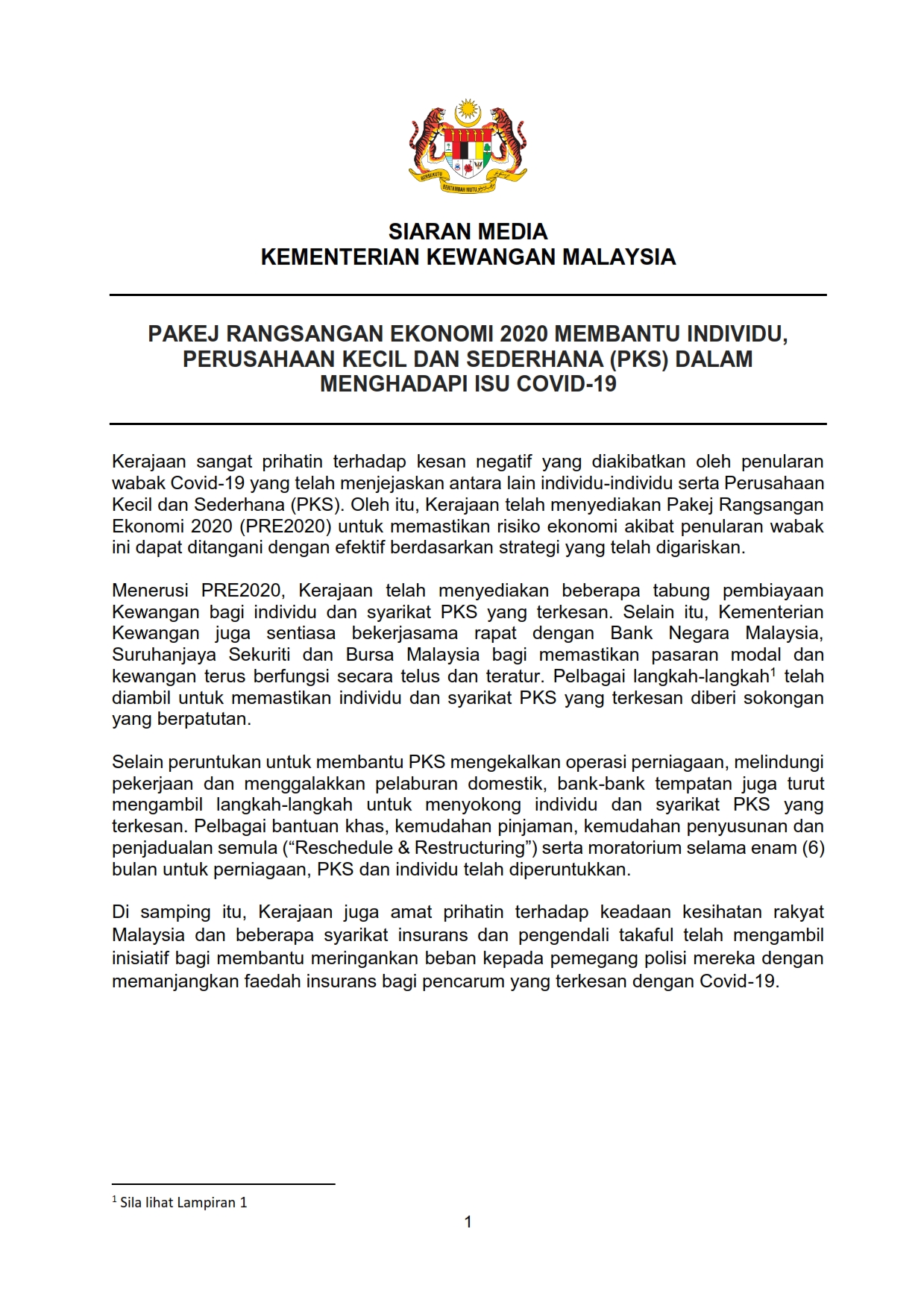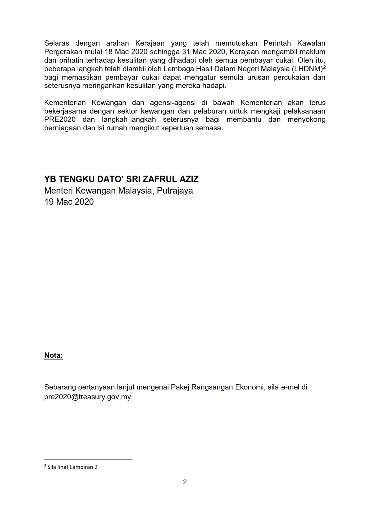 Siaran Media Kementerian Kewangan (MOF) 19/03/2020 Aiman Siaran Media 19 March 2020 Hits: 1559 Rating: ( 0 Rating ) Please Rate Vote 1 Vote 2 Vote 3 Vote 4 Vote 5 Lihat / Muat Turun PDF Lihat / Muat Turun JPG 1 Lihat / Muat Turun JPG 2 Facebook Twitter Prev Next