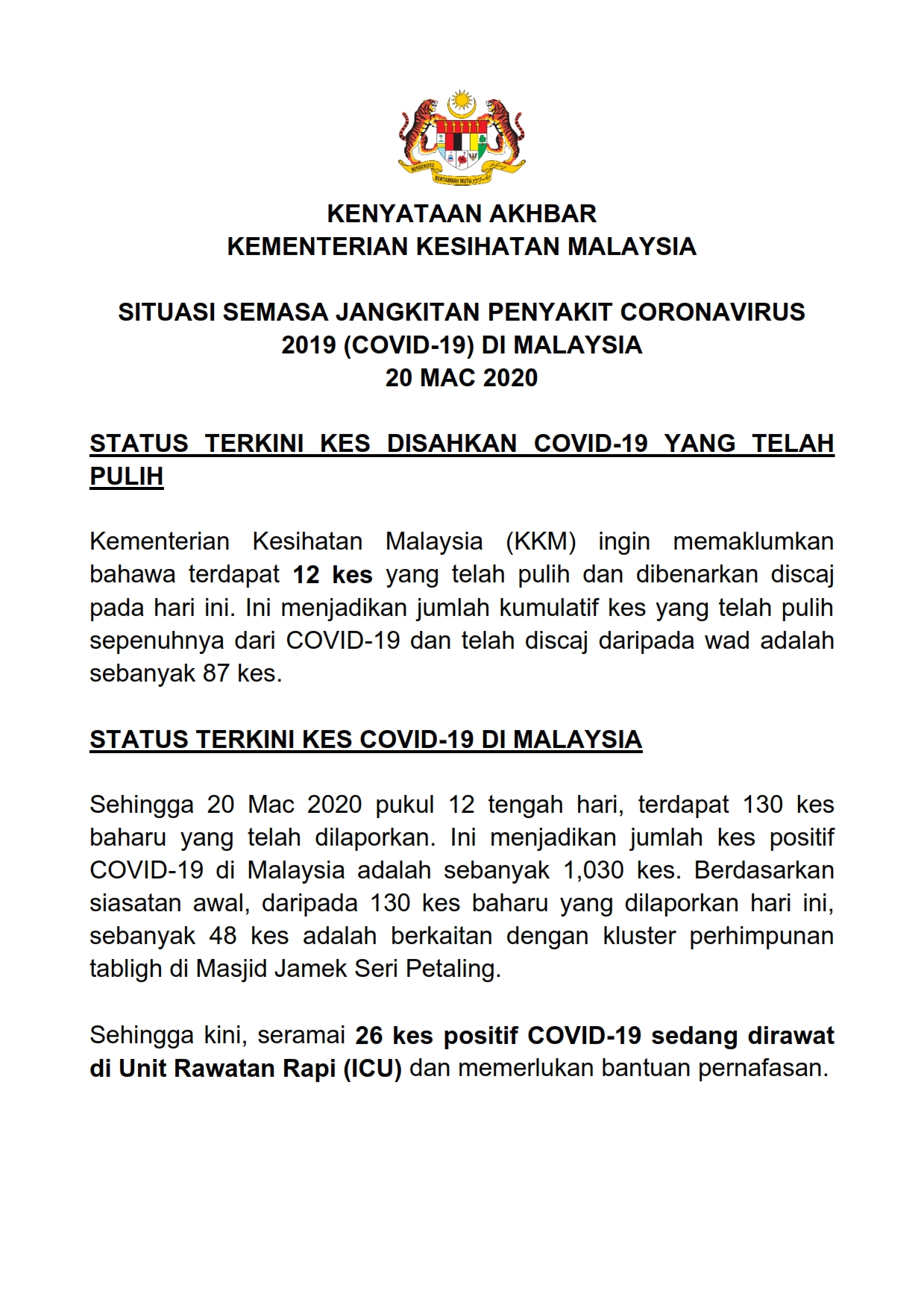 Kenyataan Akhbar KP KKM 20/03/2020 0500 PM Asrul Siaran Media 20 March 2020 Hits: 648 Rating: ( 0 Rating ) Please Rate Vote 1 Vote 2 Vote 3 Vote 4 Vote 5 Lihat / Muat Turun PDF Facebook Twitter Prev Next
