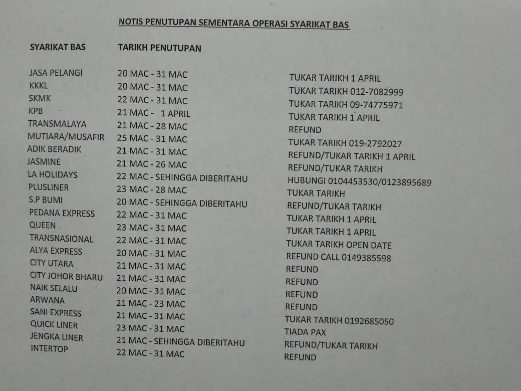 Notis Penutupan Sementara Operasi Syarikat Bas 20/03/2020 Aiman Siaran Media 20 March 2020 Hits: 917 Rating: ( 0 Rating ) Please Rate Vote 1 Vote 2 Vote 3 Vote 4 Vote 5 Lihat / Muat Turun JPG Facebook Twitter Prev Next