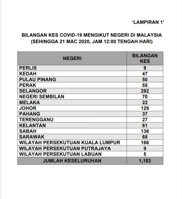 Statistik Kes COVID-19 Mengikut Negeri Di Malaysia 21/03/2020 1200 PM Asrul Siaran Media 21 March 2020 Hits: 1060 Rating: ( 0 Rating ) Please Rate Vote 1 Vote 2 Vote 3 Vote 4 Vote 5 Lihat / Muat Turun JPG Facebook Twitter Prev Next