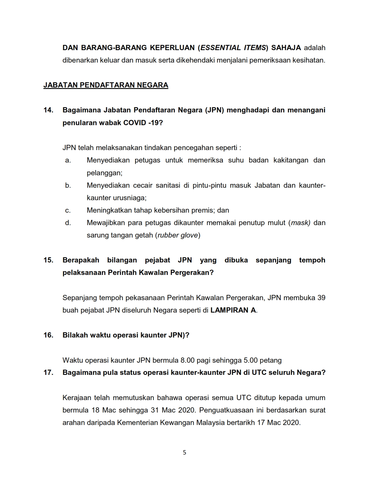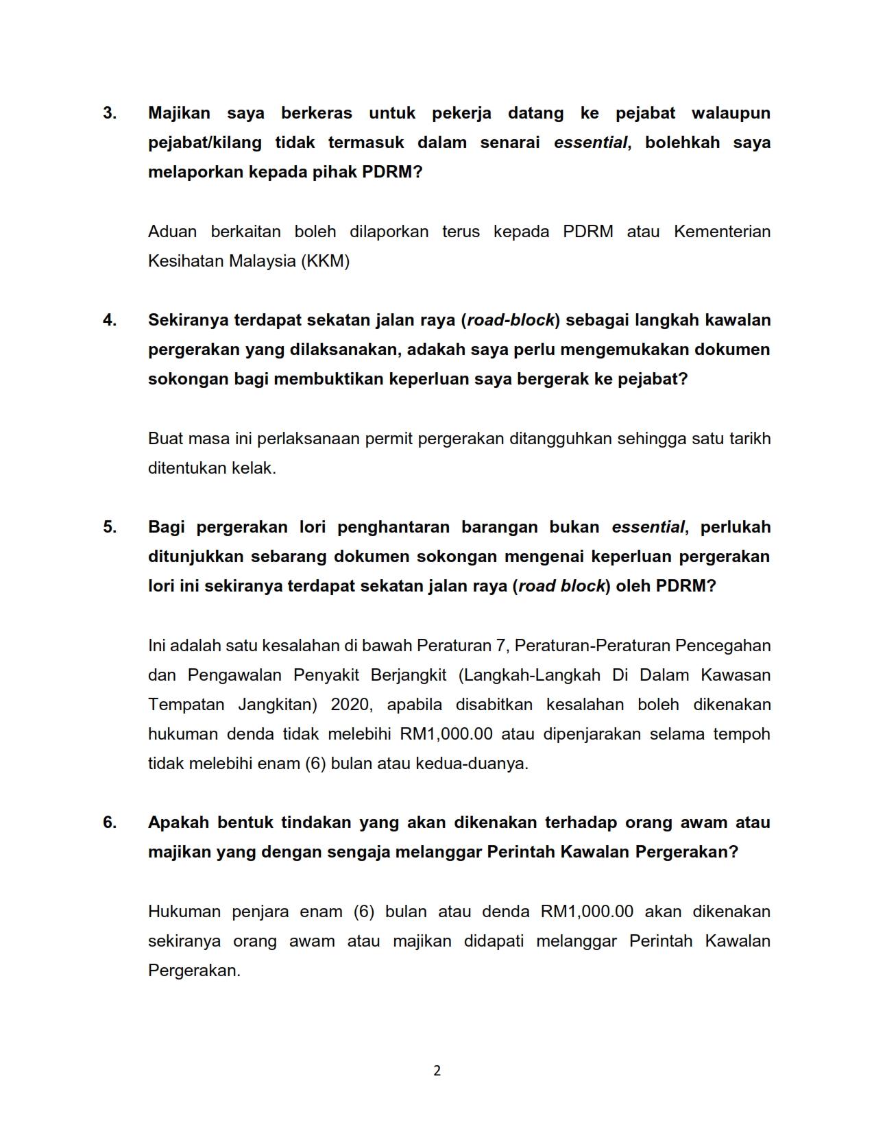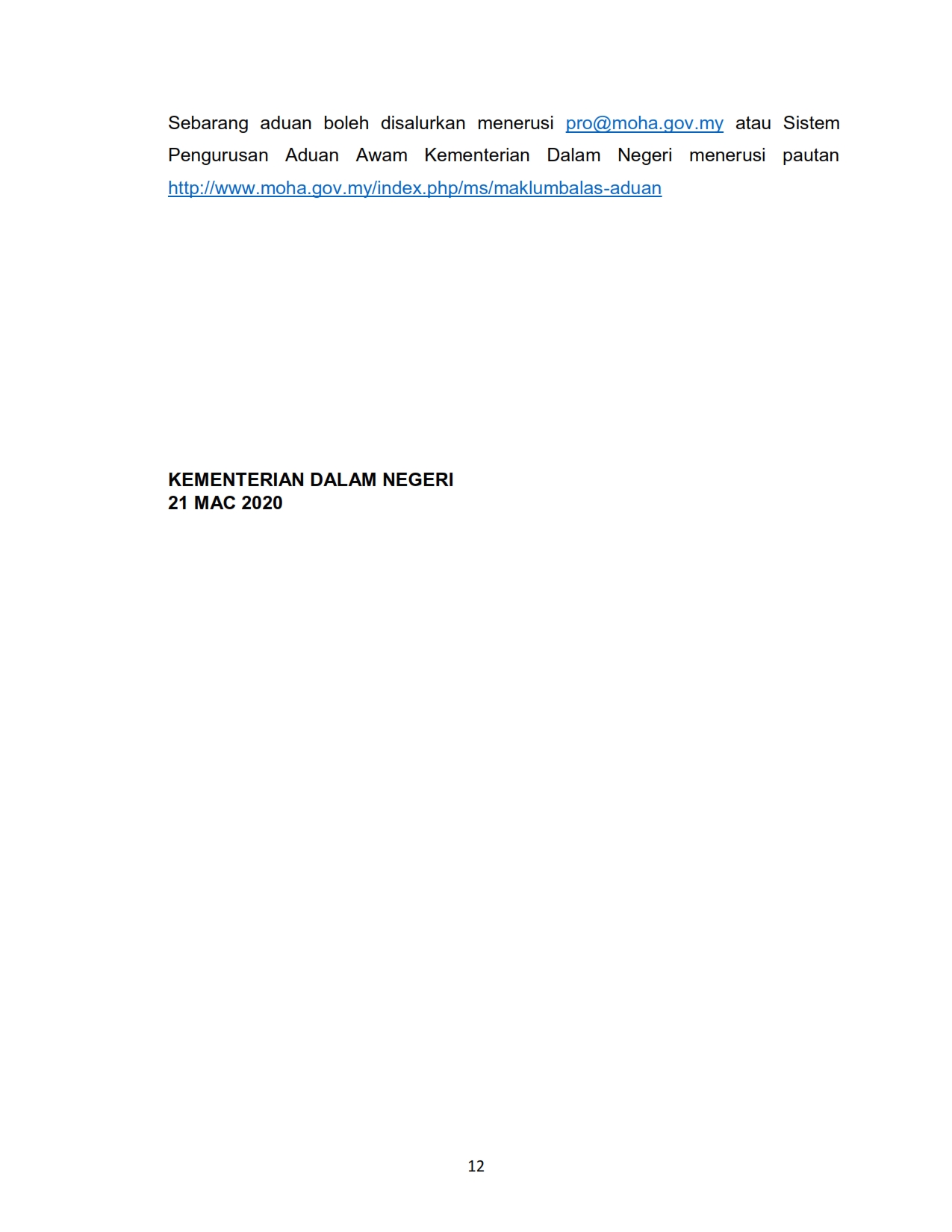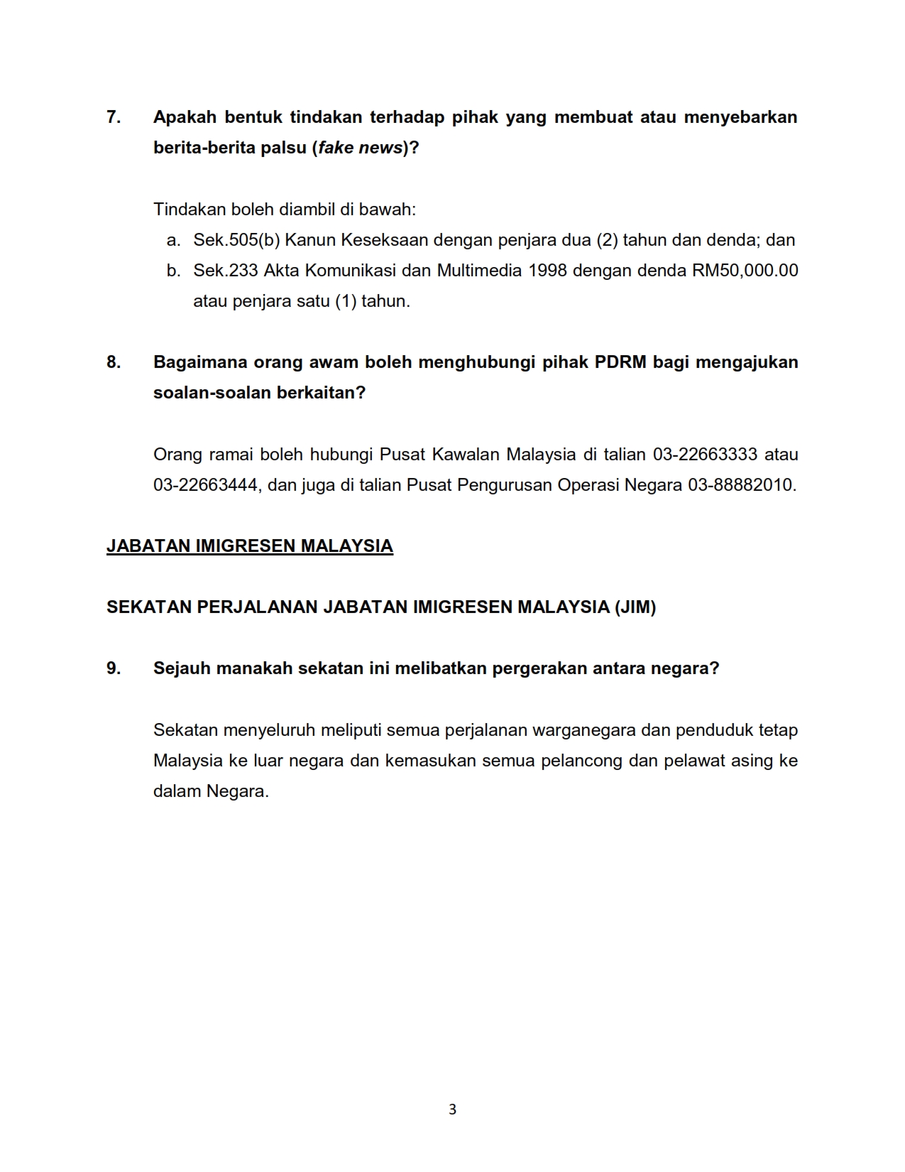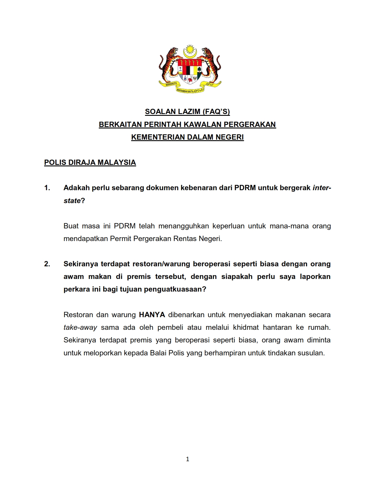 Soalan Lazim FAQ Berkaitan Perintah Kawalan Pergerakan Kementerian Dalam Negeri 21/03/2020 Aiman FAQ 21 March 2020 Hits: 1363 Rating: ( 0 Rating ) Please Rate Vote 1 Vote 2 Vote 3 Vote 4 Vote 5 /bencana2/images/ndcc/documents/covid19/faq/SIARAN_MEDIA_KKM_20200322_01.pdf Facebook Twitter Prev Next