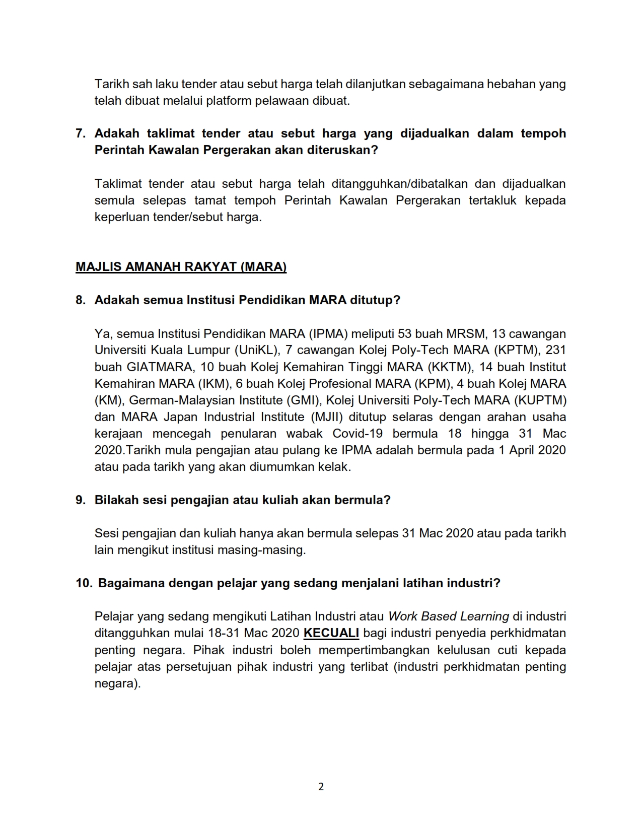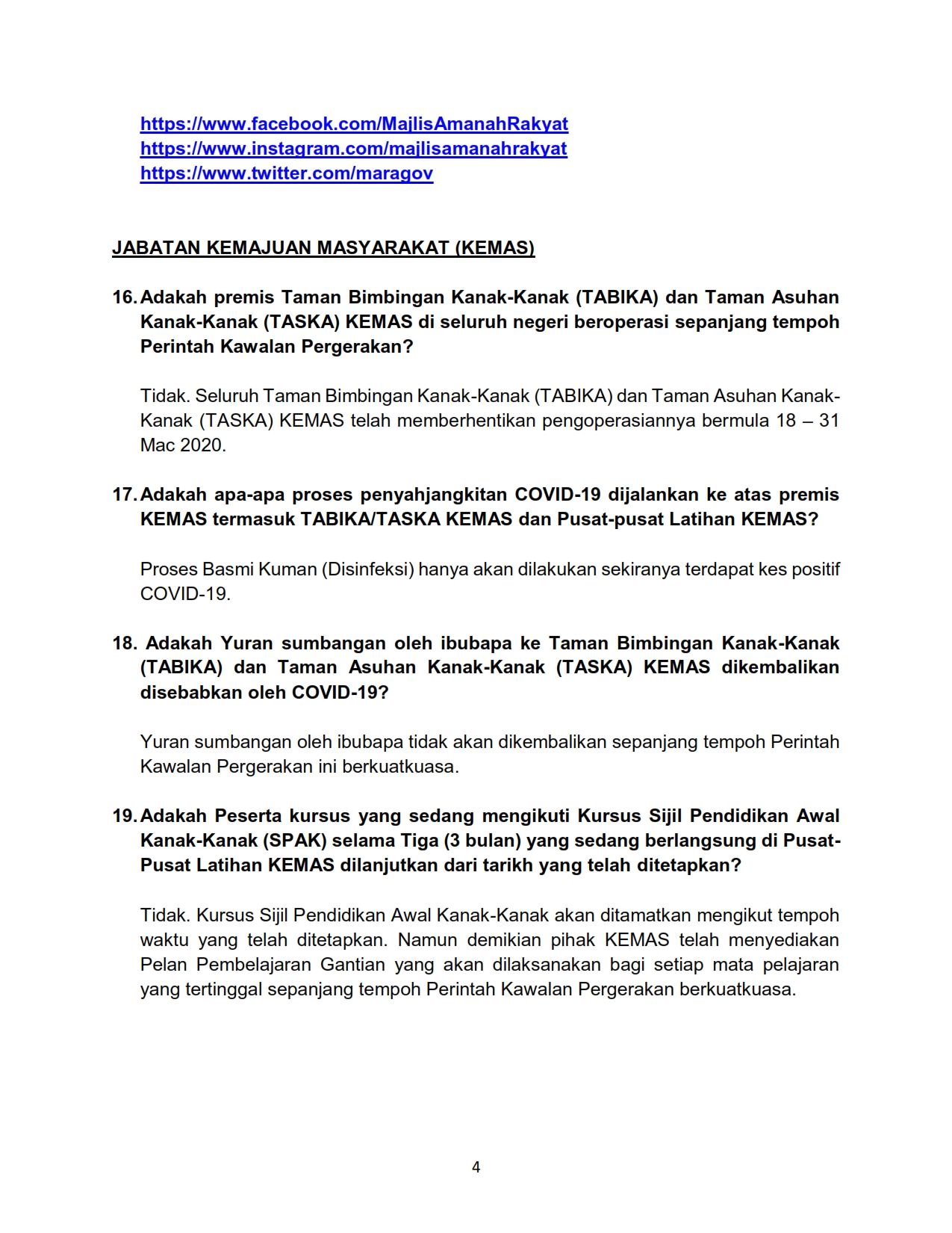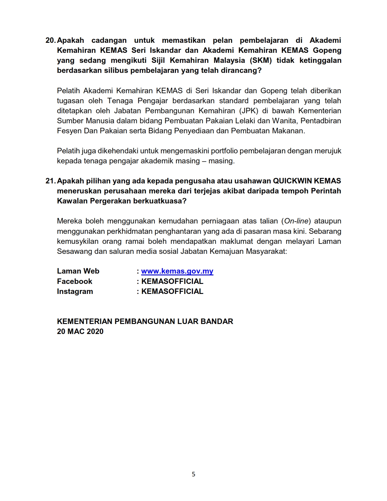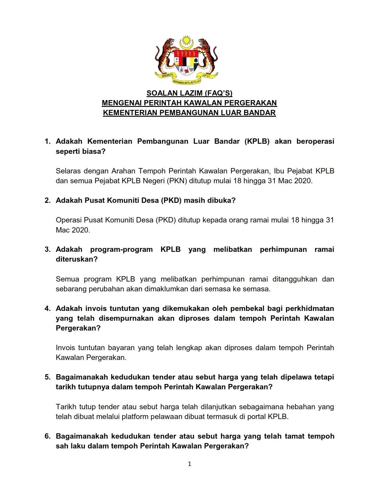 Soalan Lazim FAQ Berkaitan Perintah Kawalan Pergerakan Kementerian Pembangunan Luar Bandar 22/03/2020 Aiman FAQ 22 March 2020 Hits: 1181 Rating: ( 0 Rating ) Please Rate Vote 1 Vote 2 Vote 3 Vote 4 Vote 5 /bencana2/images/ndcc/documents/covid19/faq/SIARAN_MEDIA_KKM_20200322_4.pdf Facebook Twitter Prev Next