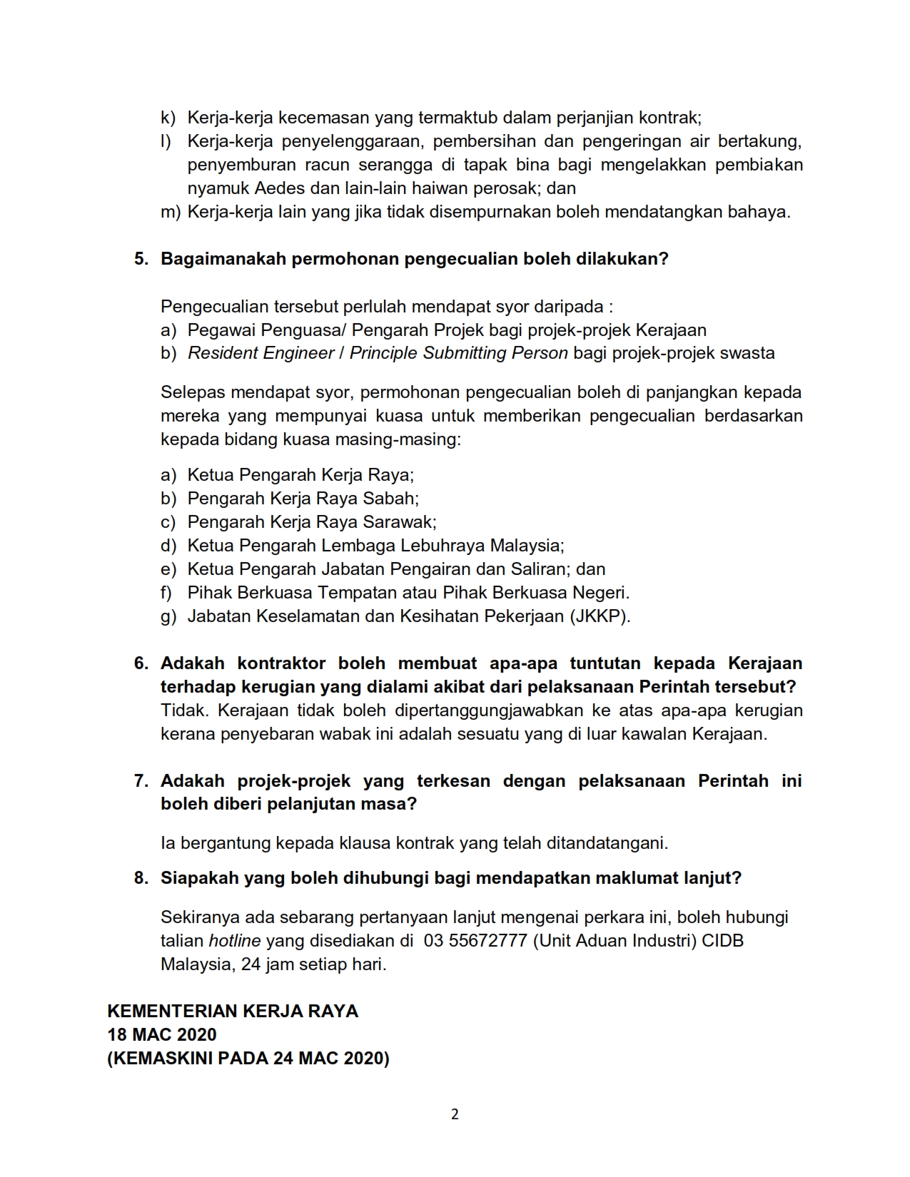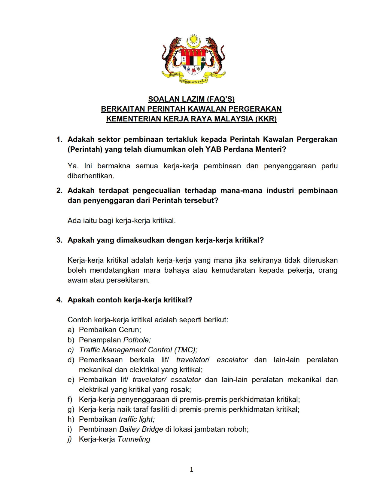 Soalan Lazim FAQ Berkaitan Perintah Kawalan Pergerakan Kementerian Kerja Raya (Dikemaskini) 24/03/2020 Aiman FAQ 24 March 2020 Hits: 1289 Rating: ( 0 Rating ) Please Rate Vote 1 Vote 2 Vote 3 Vote 4 Vote 5 /bencana2/images/ndcc/documents/covid19/faq/SIARAN_MEDIA_KKM_20200324_01.pdf Facebook Twitter Prev Next