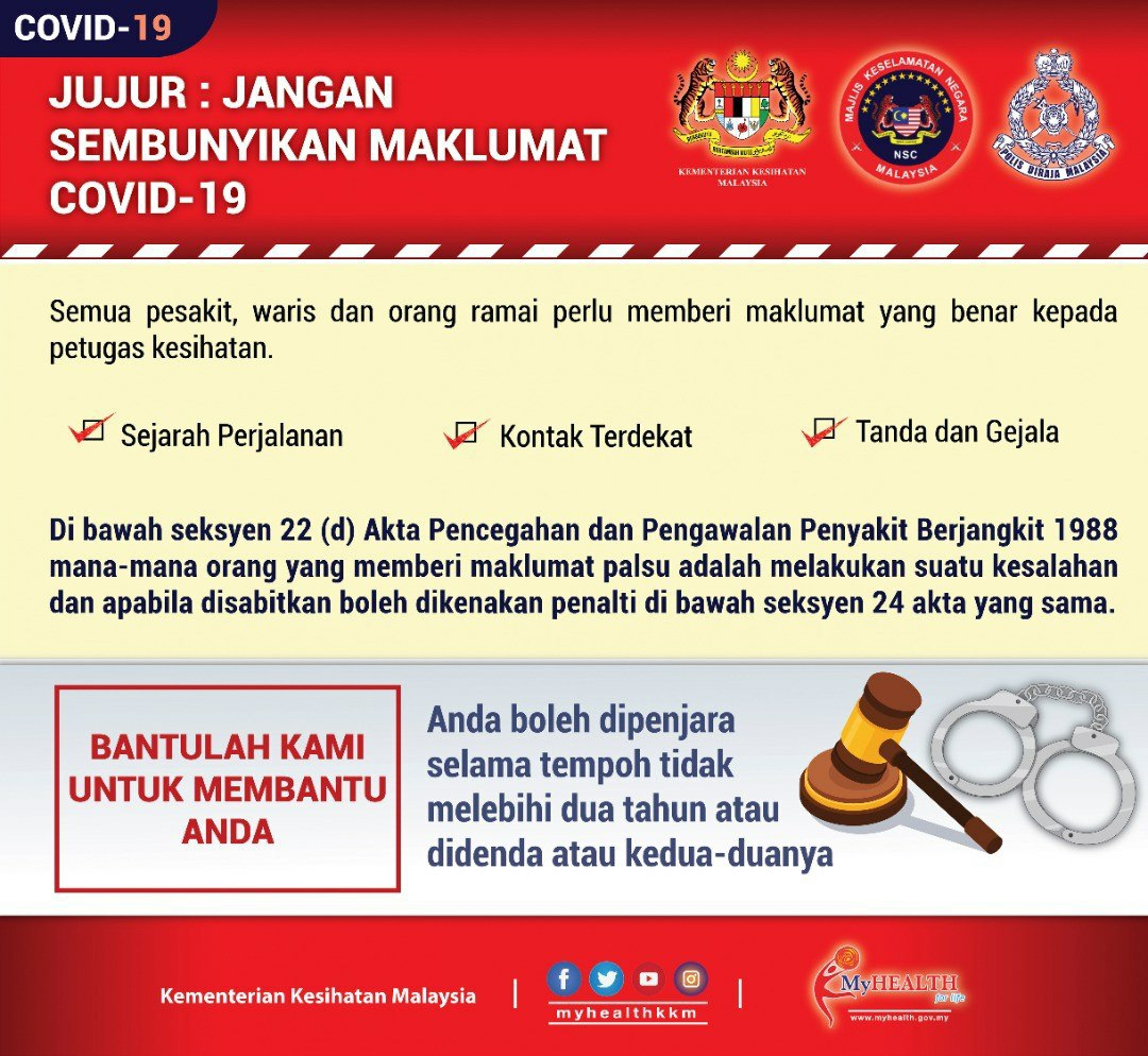 COVID-19 - Larangan Sembunyikan Maklumat 24/03/2020 Aiman Nasihat 24 March 2020 Hits: 776 Rating: ( 0 Rating ) Please Rate Vote 1 Vote 2 Vote 3 Vote 4 Vote 5 Lihat / Muat Turun JPG Facebook Twitter Prev Next