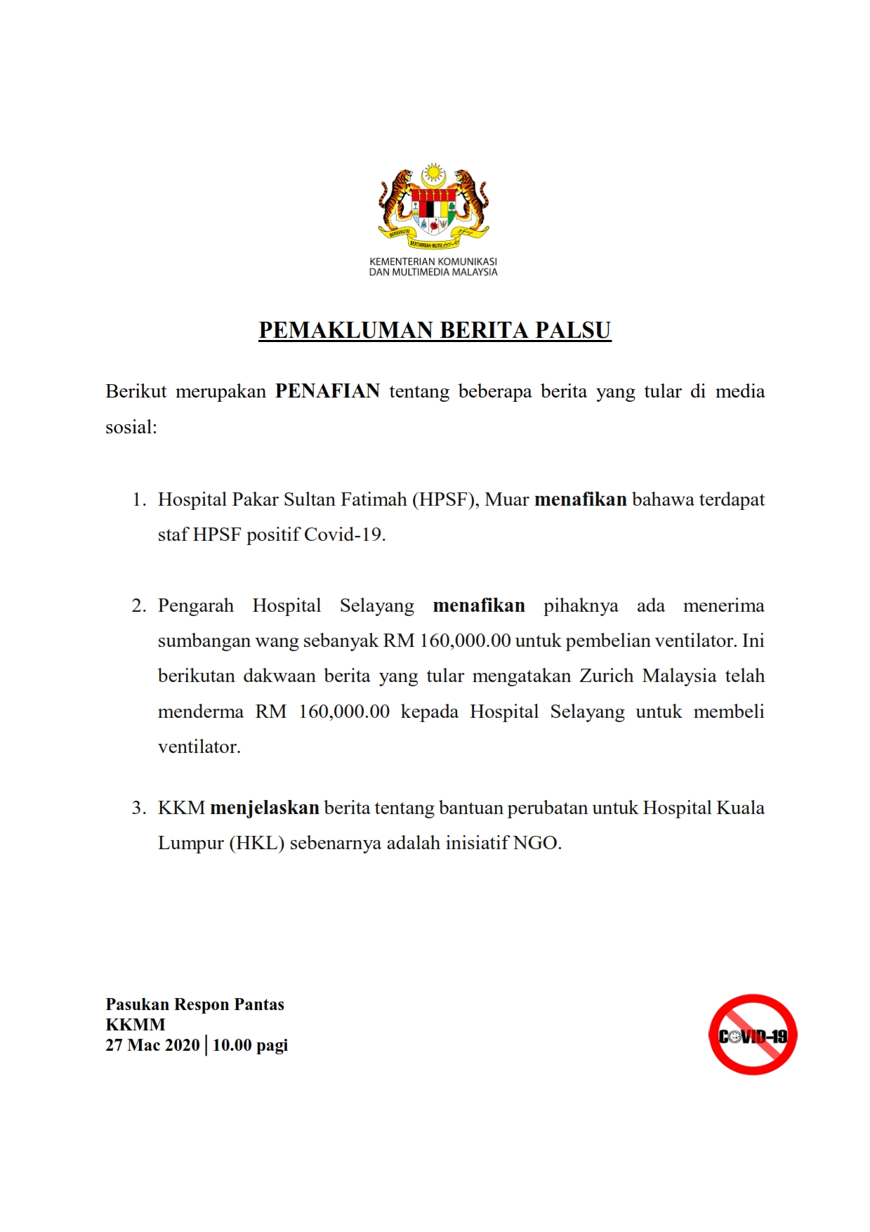 Pemakluman Berita Palsu oleh SKMM 27/03/2020 1000 AM Aiman Siaran Media 27 March 2020 Hits: 915 Rating: ( 0 Rating ) Please Rate Vote 1 Vote 2 Vote 3 Vote 4 Vote 5 Lihat / Muat Turun PDF Facebook Twitter Prev Next