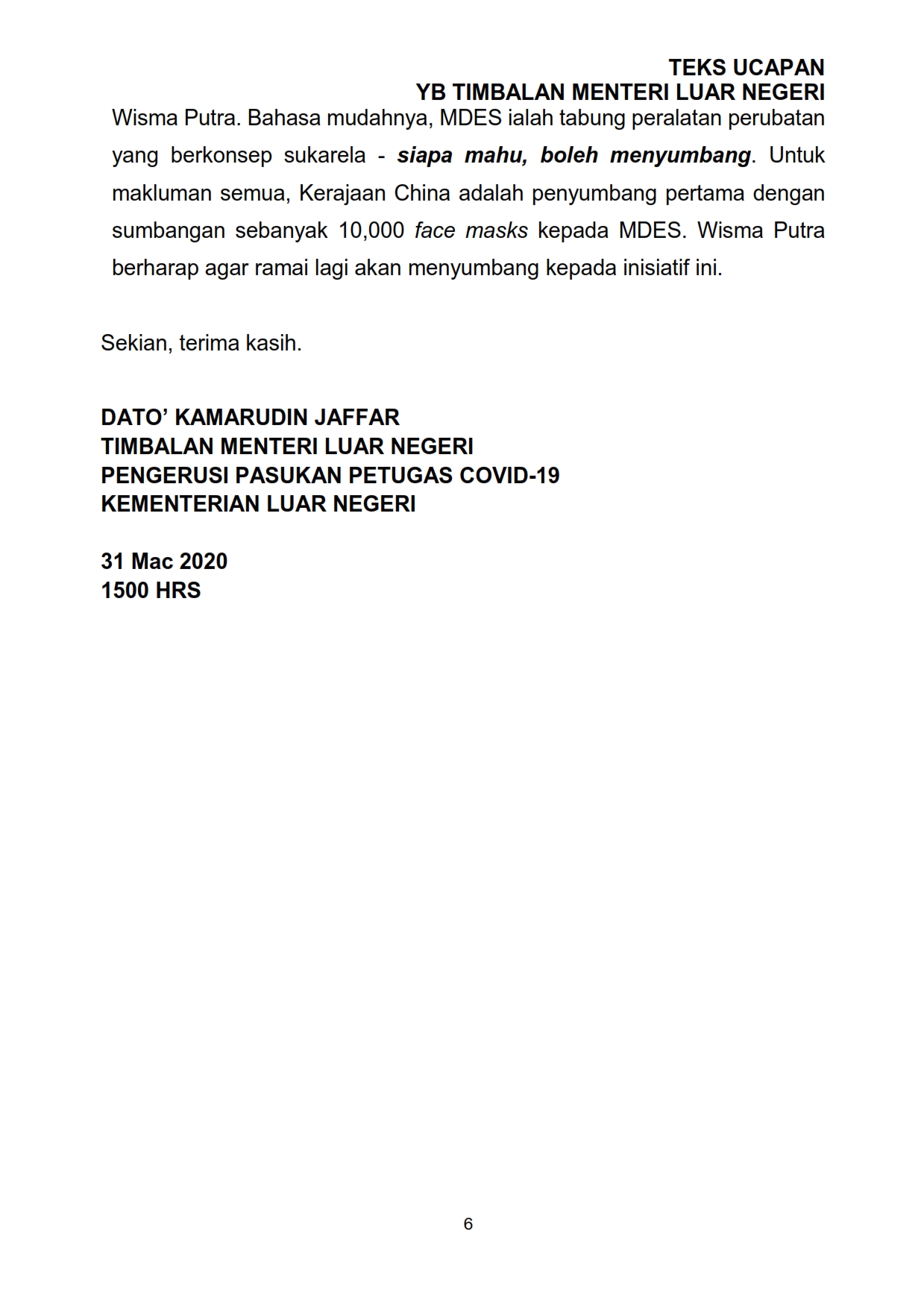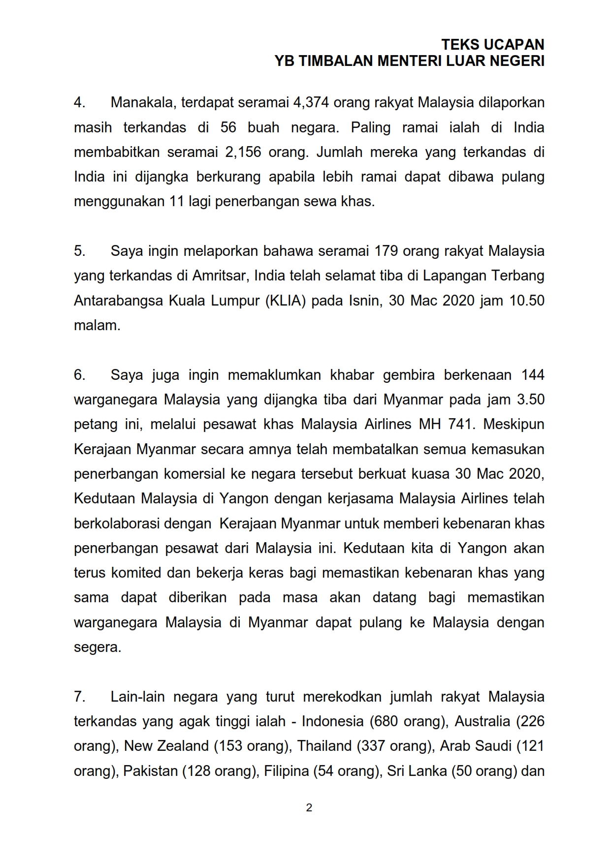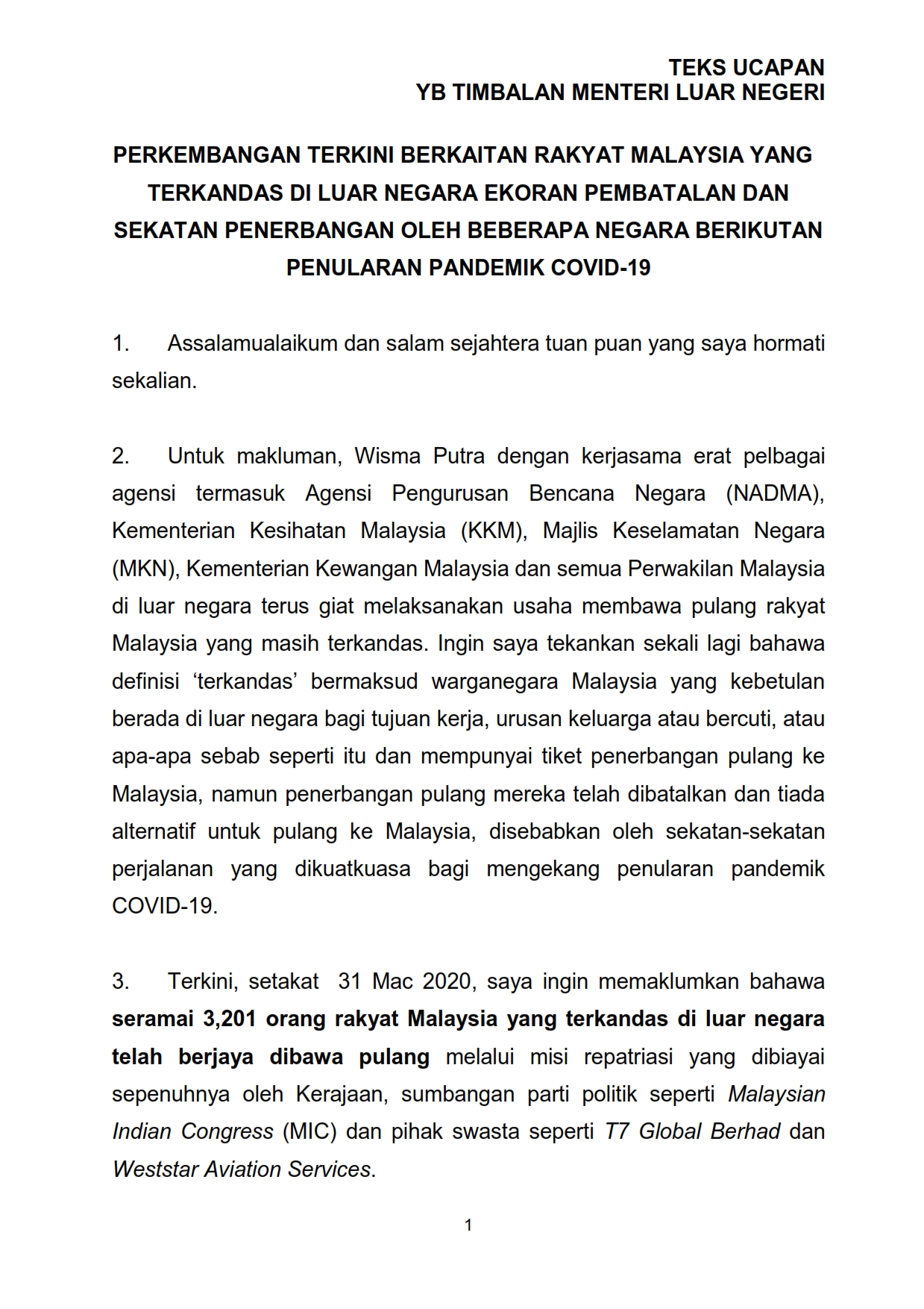 Teks Ucapan YB Timbalan Menteri Luar Negeri 31/03/2020 0300PM Aiman Siaran Media 31 March 2020 Hits: 1724 Rating: ( 0 Rating ) Please Rate Vote 1 Vote 2 Vote 3 Vote 4 Vote 5 Lihat / Muat Turun PDF Facebook Twitter Prev Next