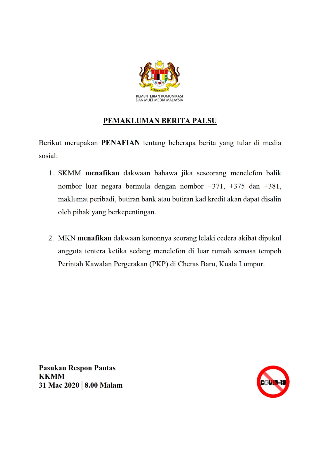 Pemakluman Berita Palsu SKMM 31/03/2020 0800 PM Aiman Siaran Media 31 March 2020 Hits: 936 Rating: ( 0 Rating ) Please Rate Vote 1 Vote 2 Vote 3 Vote 4 Vote 5 Lihat / Muat Turun PDF Facebook Twitter Prev Next