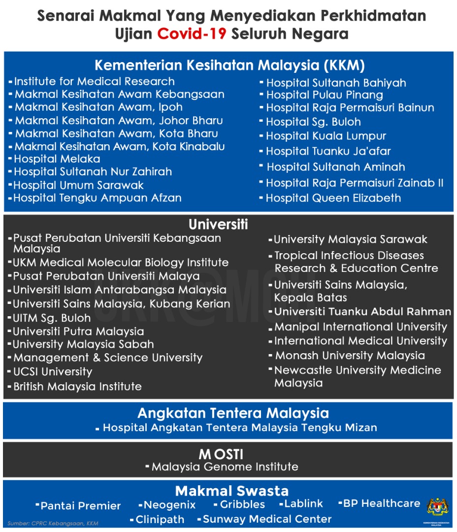 COVID-19 - Senarai Makmal Yang Menyediakan Perkhidmatan Ujian COVID-19 Di Malaysia Asrul Siaran Media 01 April 2020 Hits: 1514 Rating: ( 0 Rating ) Please Rate Vote 1 Vote 2 Vote 3 Vote 4 Vote 5 Lihat / Muat Turun JPG Facebook Twitter Prev Next