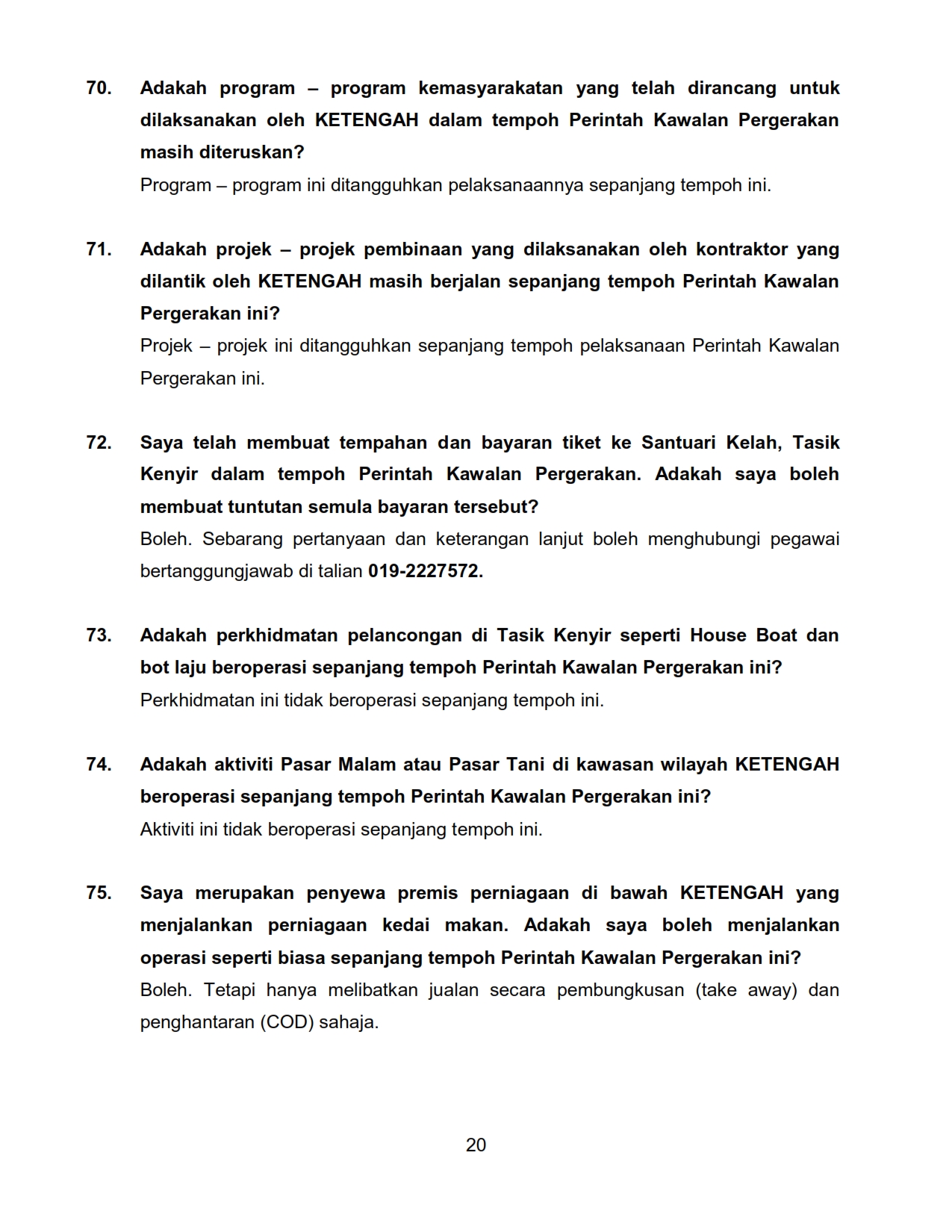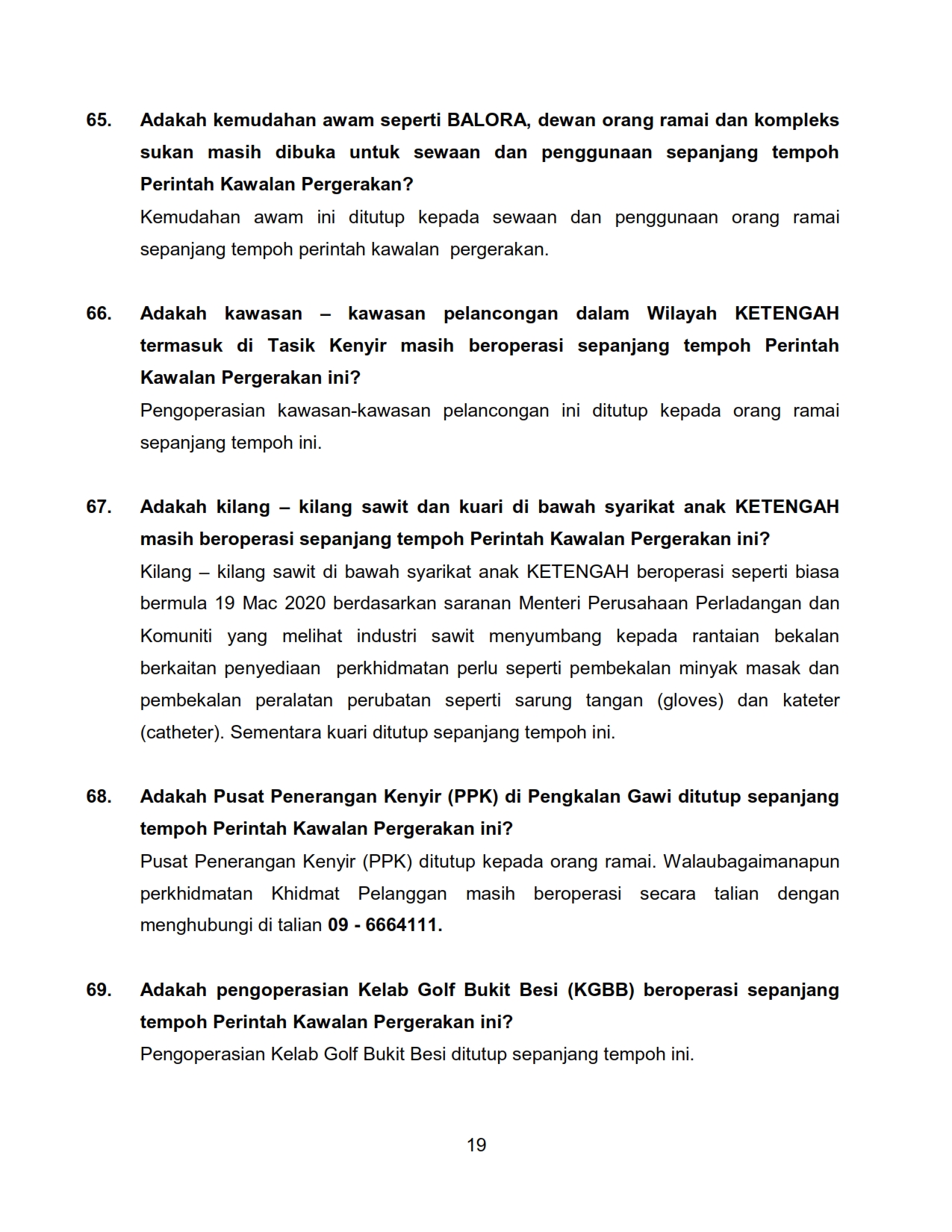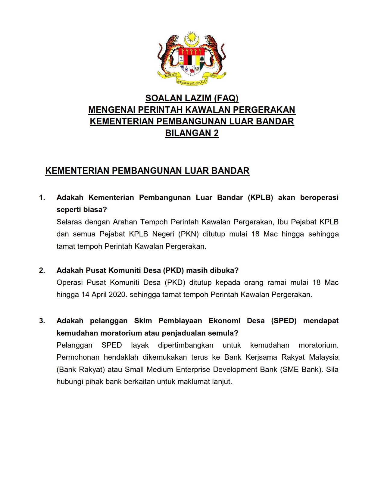 FAQ - Berkaitan Perintah Kawalan Pergerakan KPLB Bil.2 01/04/2020 Aiman FAQ 01 April 2020 Hits: 1782 Rating: ( 0 Rating ) Please Rate Vote 1 Vote 2 Vote 3 Vote 4 Vote 5 /bencana2/images/ndcc/documents/covid19/faq/SIARAN_MEDIA_KKM_20200401_10.pdf Facebook Twitter Prev Next