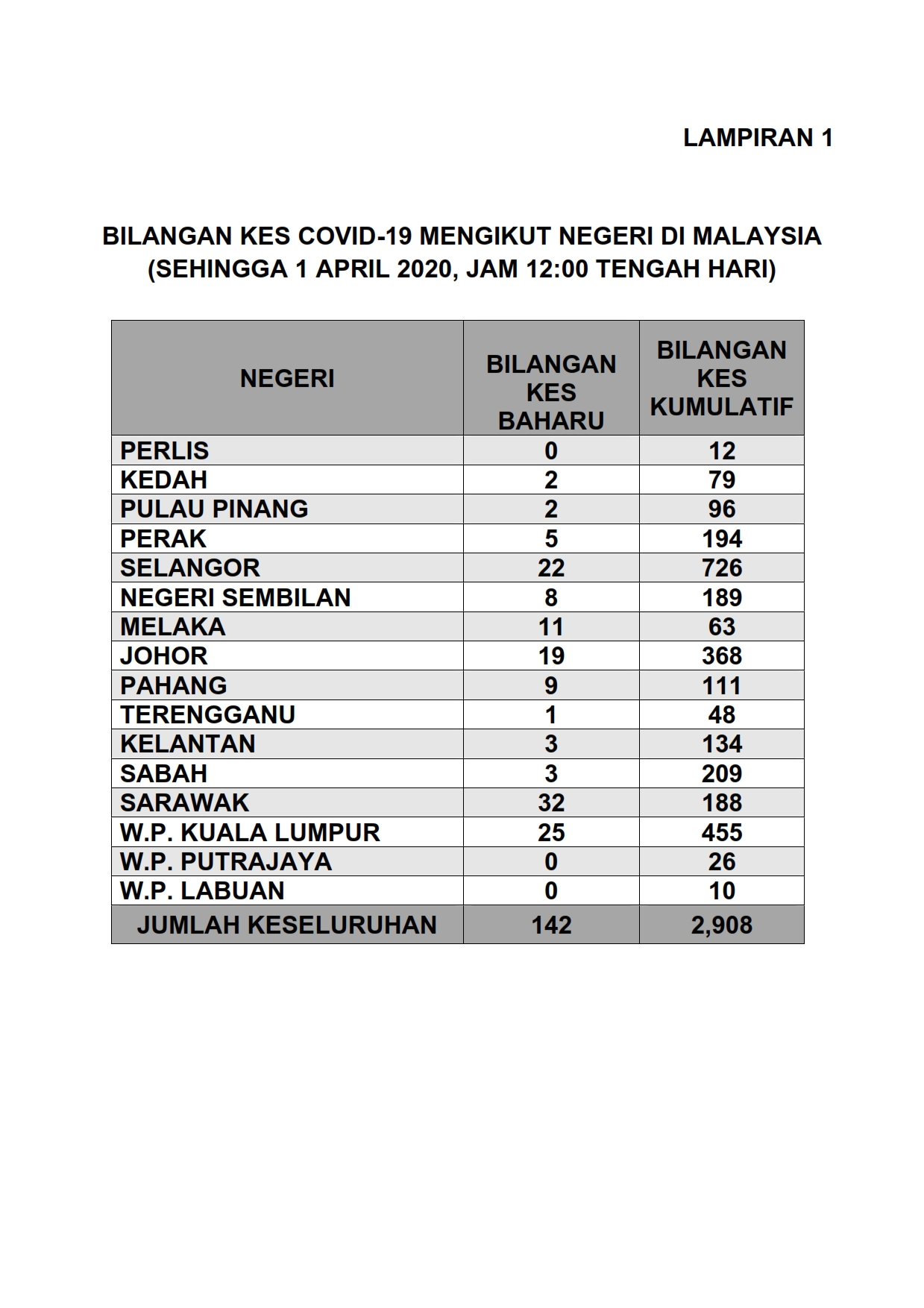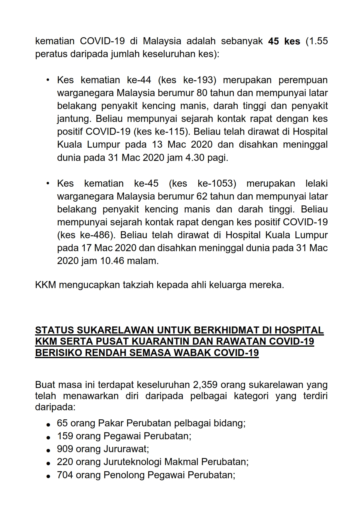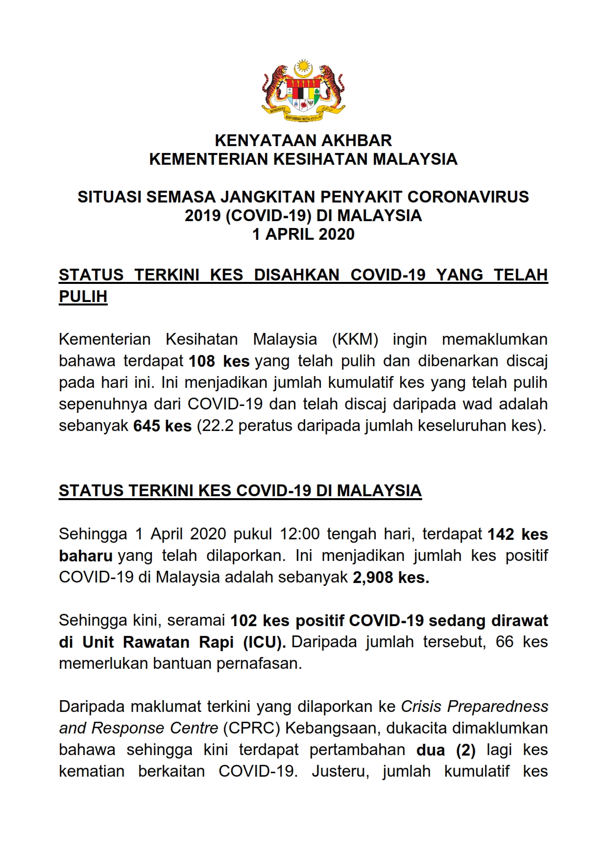 Kenyataan Akhbar KP KKM 01/04/2020 0500PM Aiman Siaran Media 01 April 2020 Hits: 1193 Rating: ( 0 Rating ) Please Rate Vote 1 Vote 2 Vote 3 Vote 4 Vote 5 Lihat / Muat Turun PDF Facebook Twitter Prev Next