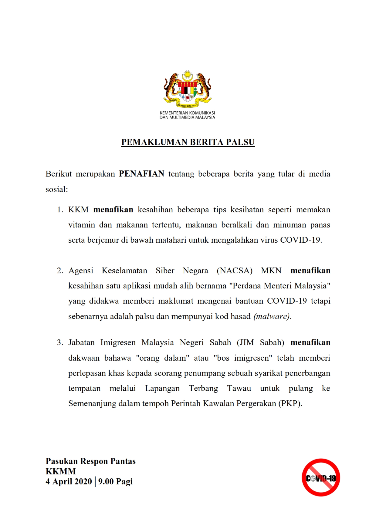 Pemakluman Berita Palsu SKMM 04/04/2020 0900 AM Aiman Siaran Media 04 April 2020 Hits: 761 Rating: ( 0 Rating ) Please Rate Vote 1 Vote 2 Vote 3 Vote 4 Vote 5 Lihat / Muat Turun PDF Facebook Twitter Prev Next