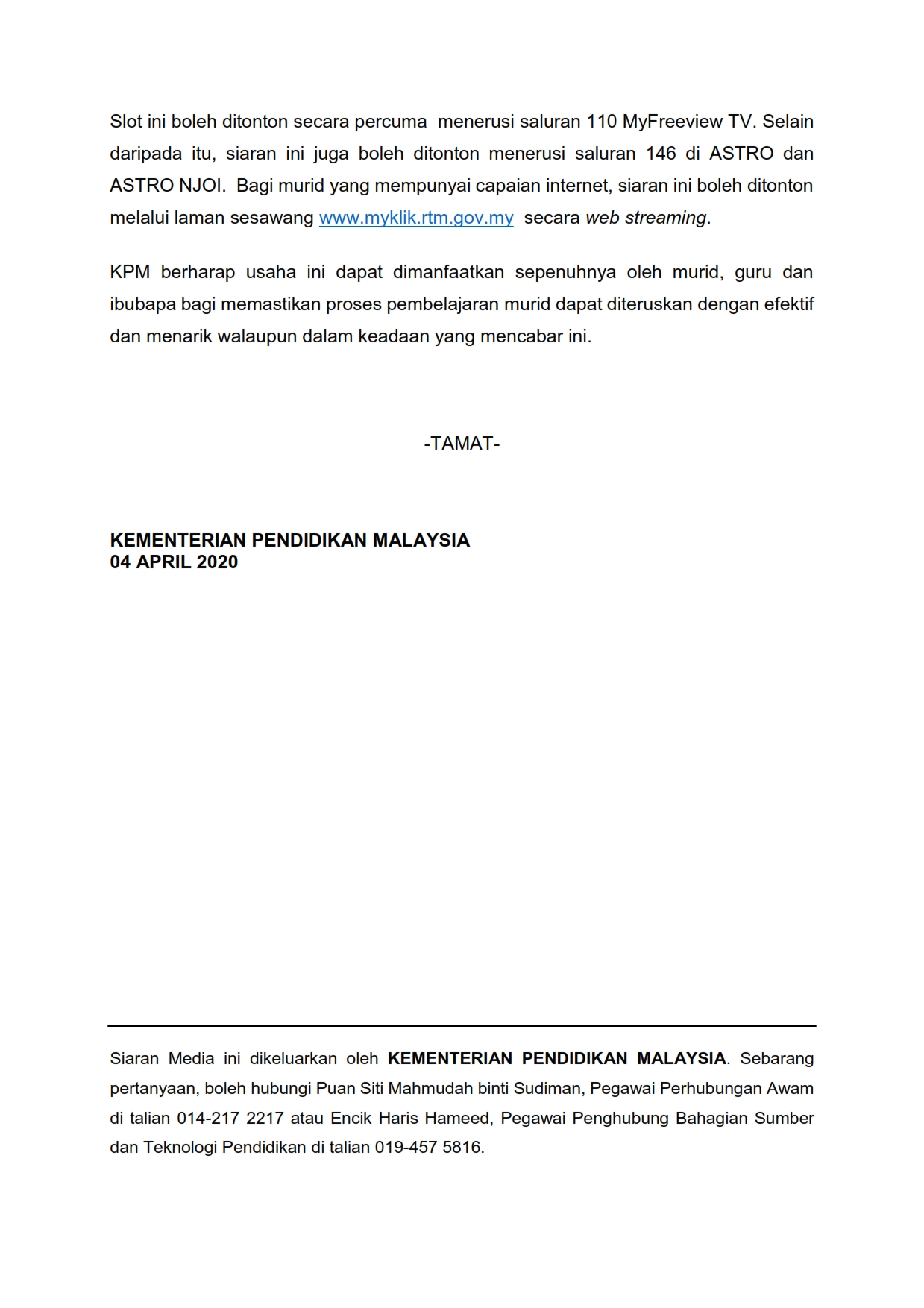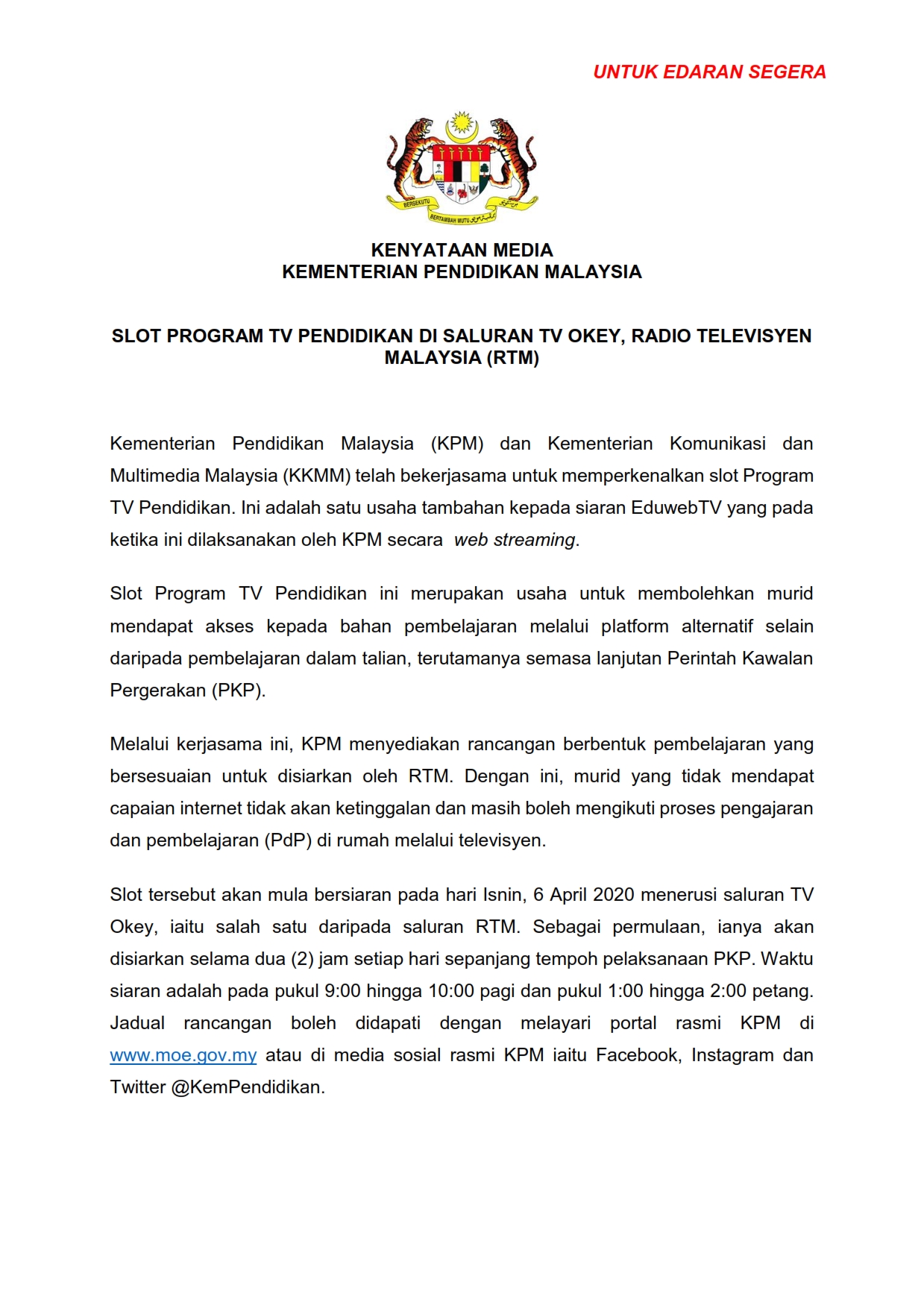 Kenyataan Media Kementerian Pendidikan Malaysia 04/04/2020 Aiman Siaran Media 04 April 2020 Hits: 1341 Rating: ( 0 Rating ) Please Rate Vote 1 Vote 2 Vote 3 Vote 4 Vote 5 Lihat / Muat Turun PDF Facebook Twitter Prev Next