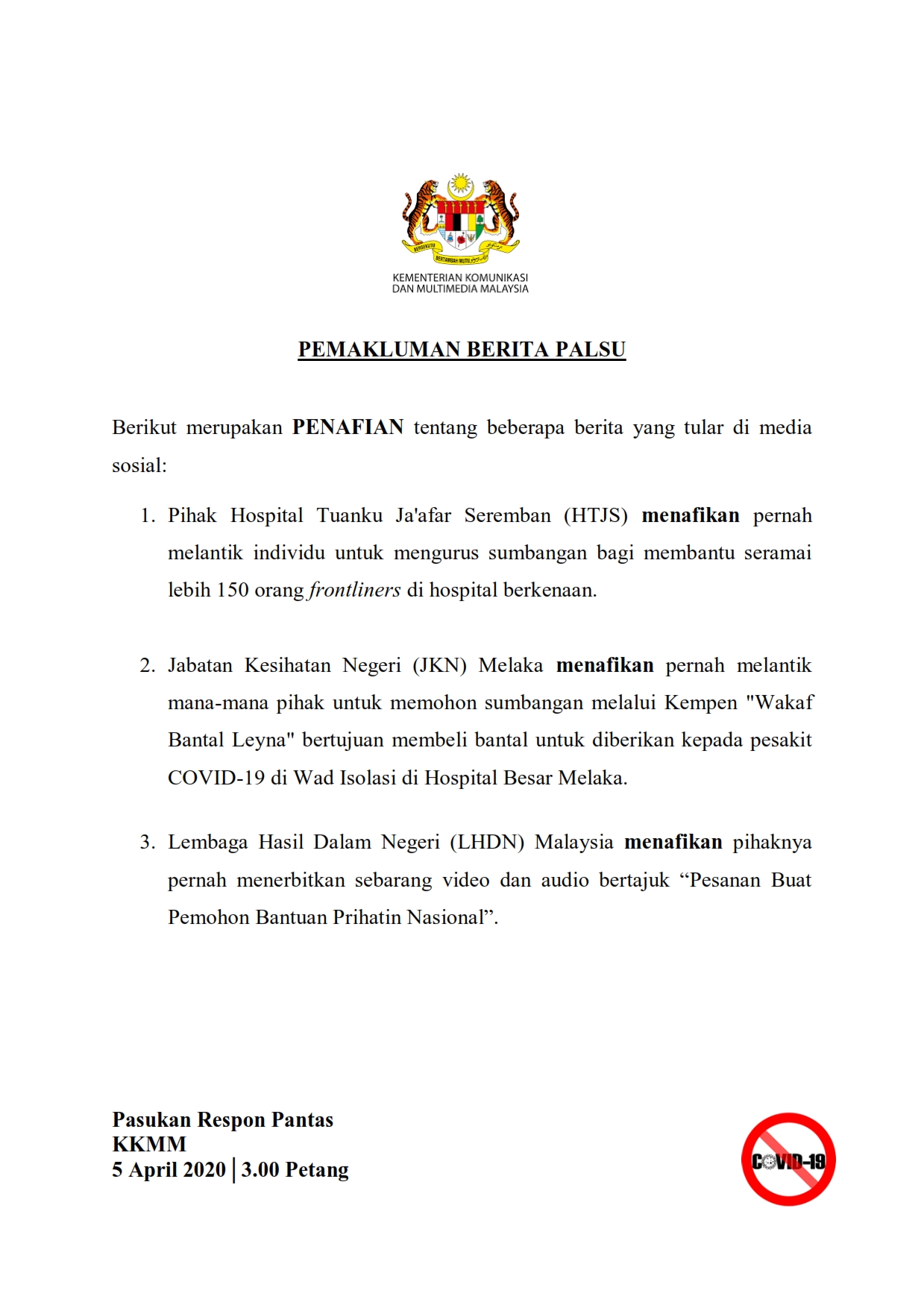 Pemakluman Berita Palsu SKMM 05/04/2020 0300 PM Asrul Siaran Media 05 April 2020 Hits: 788 Rating: ( 0 Rating ) Please Rate Vote 1 Vote 2 Vote 3 Vote 4 Vote 5 Lihat / Muat Turun PDF Facebook Twitter Prev Next