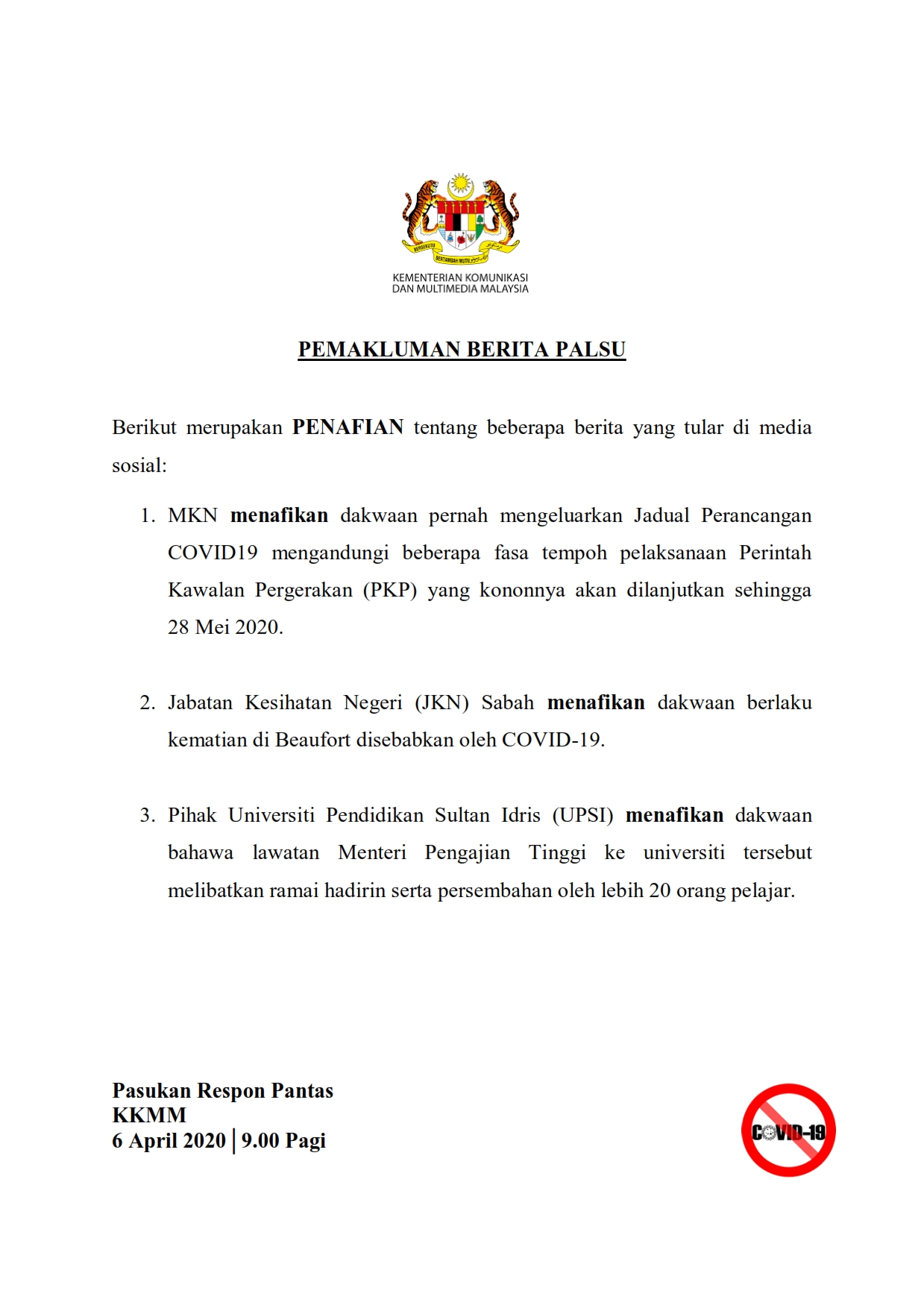 Pemakluman Berita Palsu SKMM 06/04/2020 0900 AM Aiman Siaran Media 06 April 2020 Hits: 1148 Rating: ( 0 Rating ) Please Rate Vote 1 Vote 2 Vote 3 Vote 4 Vote 5 Lihat / Muat Turun PDF Facebook Twitter Prev Next
