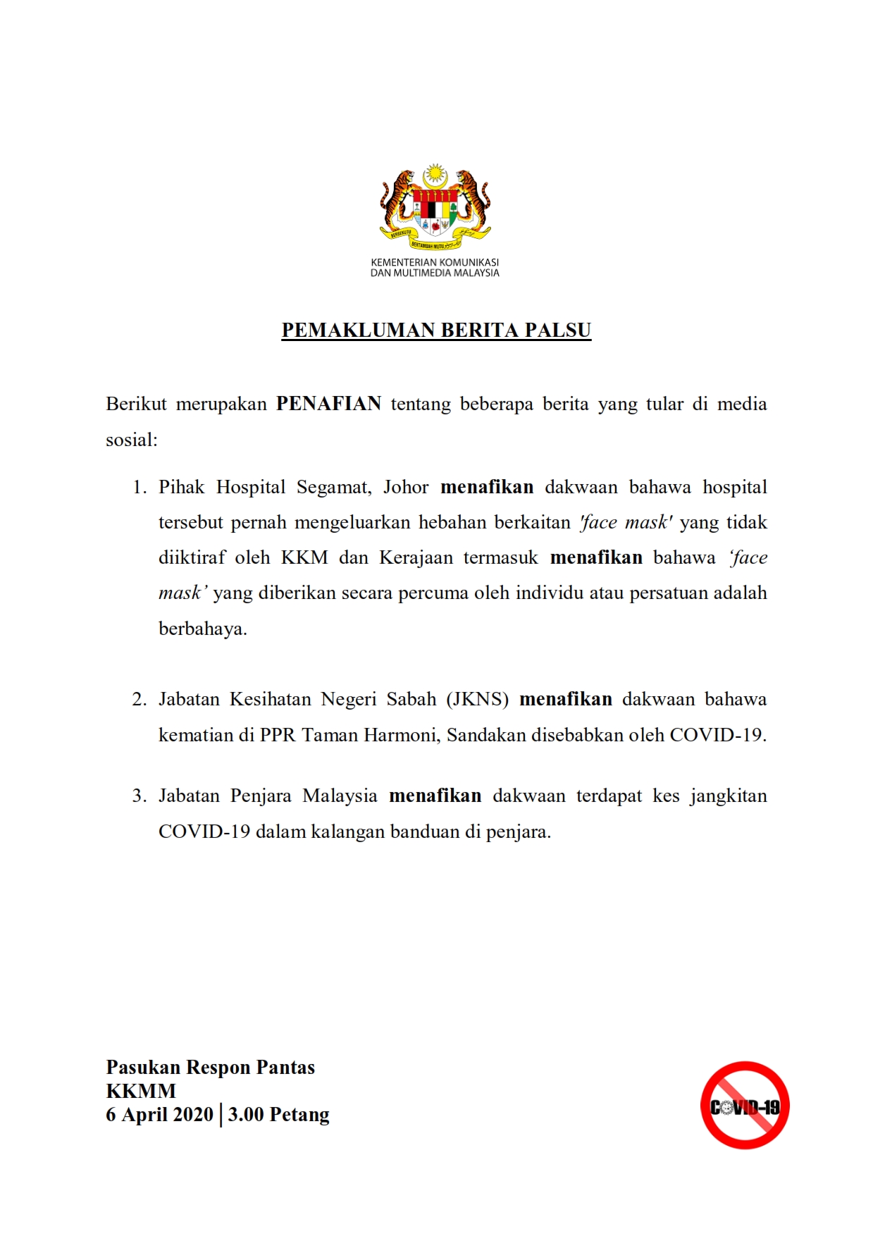 Pemakluman Berita Palsu SKMM 06/04/2020 0300 PM Aiman Siaran Media 06 April 2020 Hits: 819 Rating: ( 0 Rating ) Please Rate Vote 1 Vote 2 Vote 3 Vote 4 Vote 5 Lihat / Muat Turun PDF Facebook Twitter Prev Next