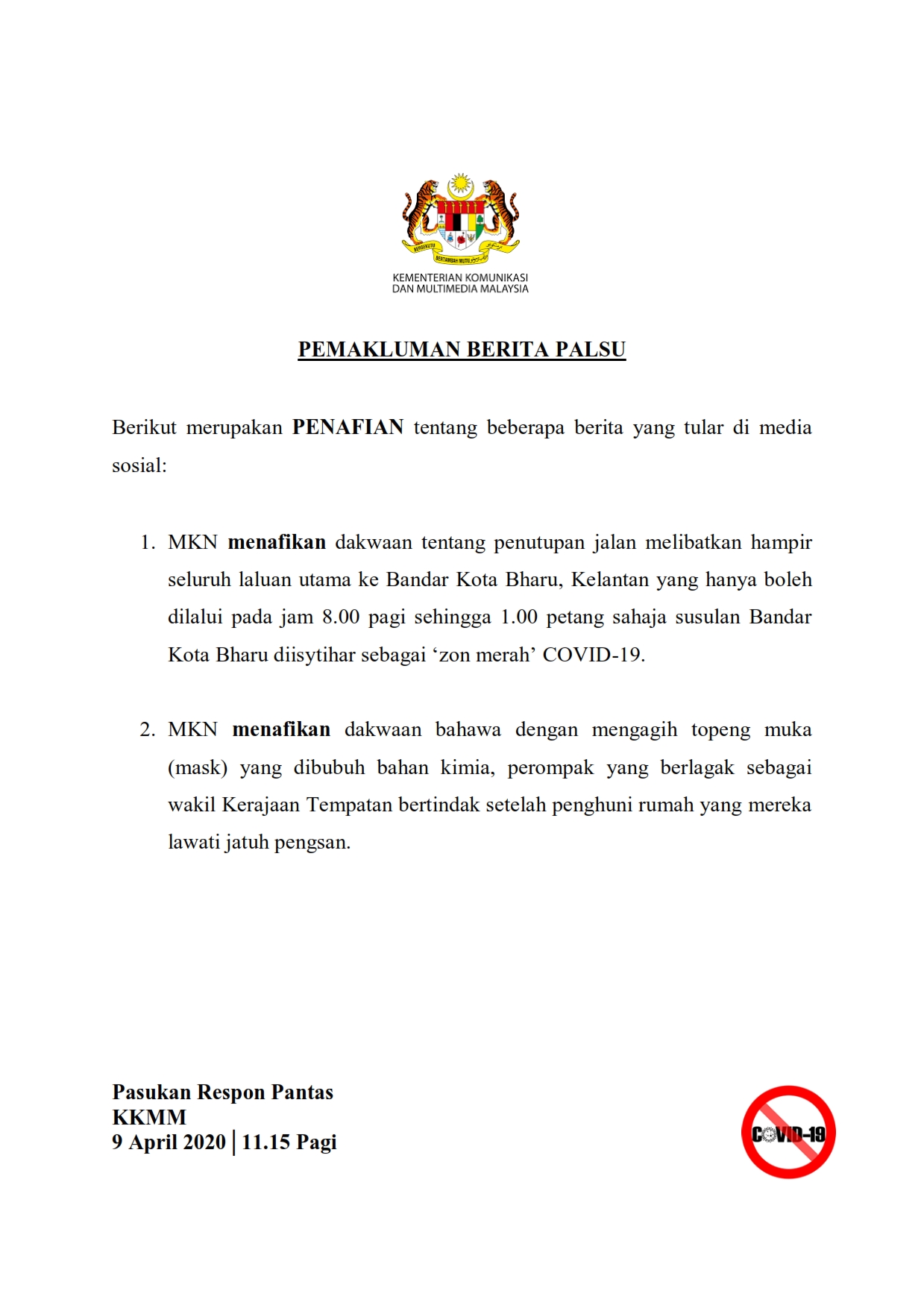 Pemakluman Berita Palsu SKMM 09/04/2020 1115 AM Aiman Siaran Media 09 April 2020 Hits: 868 Rating: ( 0 Rating ) Please Rate Vote 1 Vote 2 Vote 3 Vote 4 Vote 5 Lihat / Muat Turun PDF Facebook Twitter Prev Next