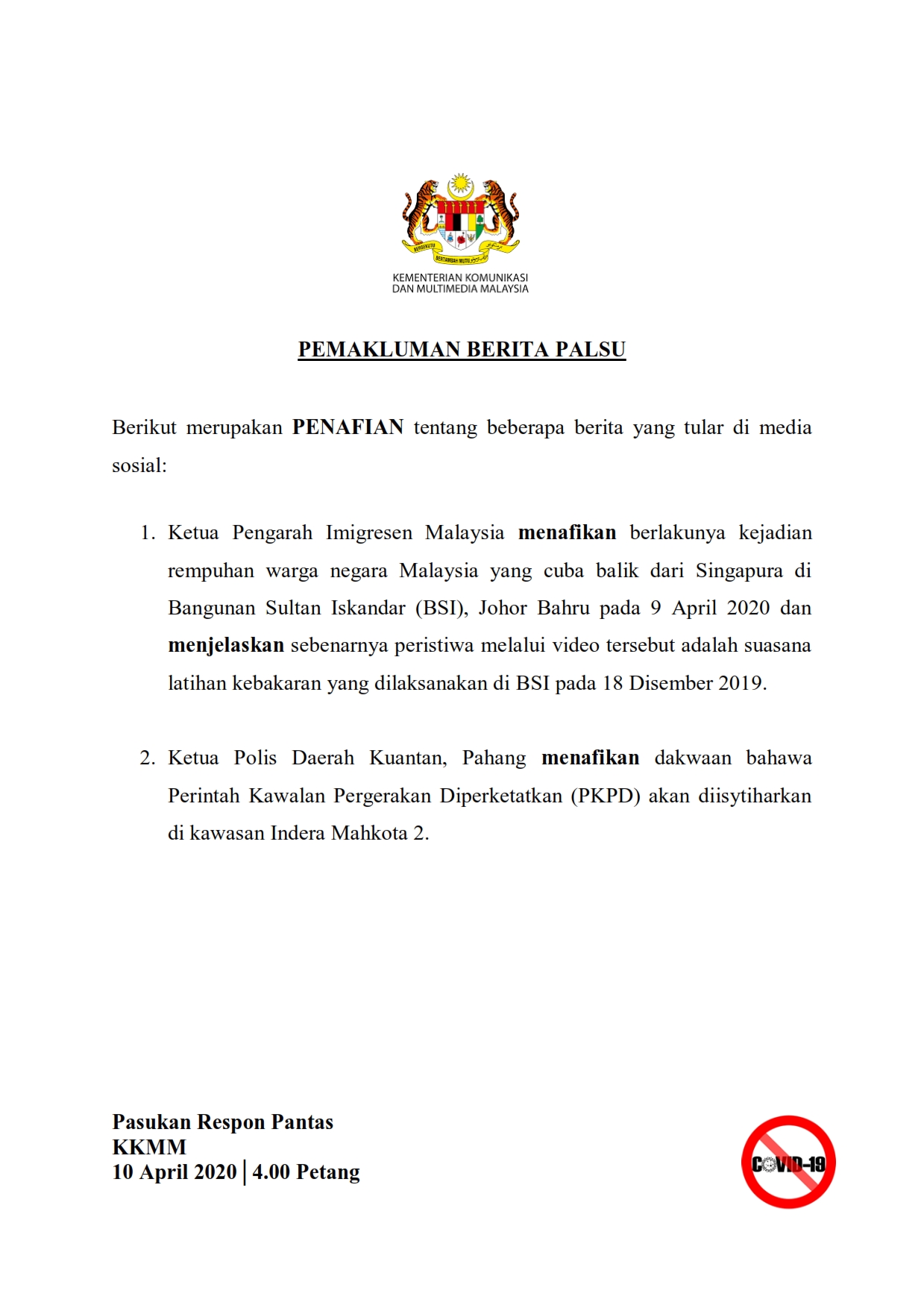Pemakluman Berita Palsu SKMM 10/04/2020 0400 PM Aiman Siaran Media 10 April 2020 Hits: 812 Rating: ( 0 Rating ) Please Rate Vote 1 Vote 2 Vote 3 Vote 4 Vote 5 Lihat / Muat Turun PDF Facebook Twitter Prev Next