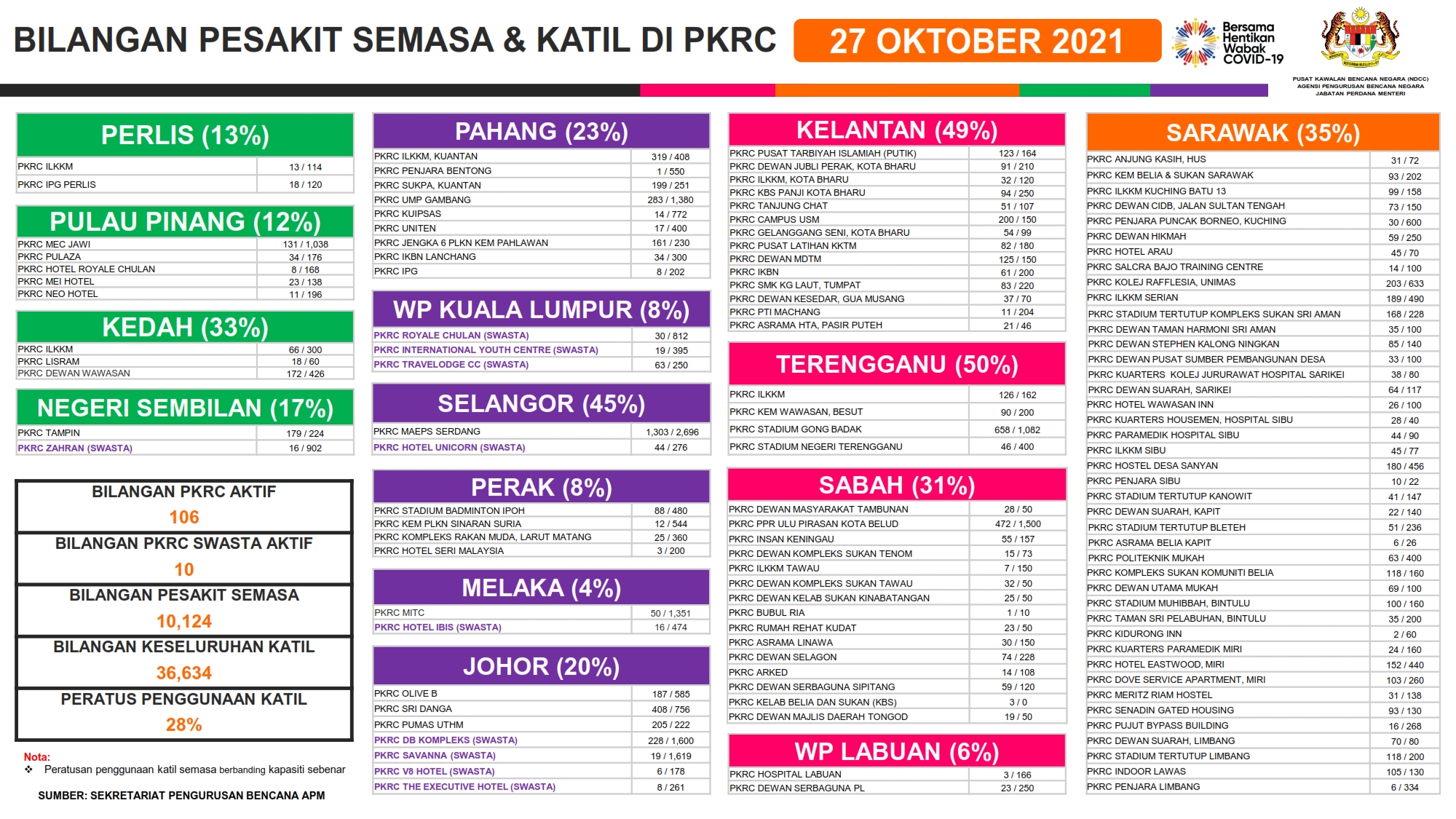 Situasi Terkini Stesen Kuarantin & Rawatan Covid-19 Berisiko Rendah (PKRC) 27/10/2021 Aiman Siaran Media 27 October 2021 Hits: 755 Rating: ( 0 Rating )